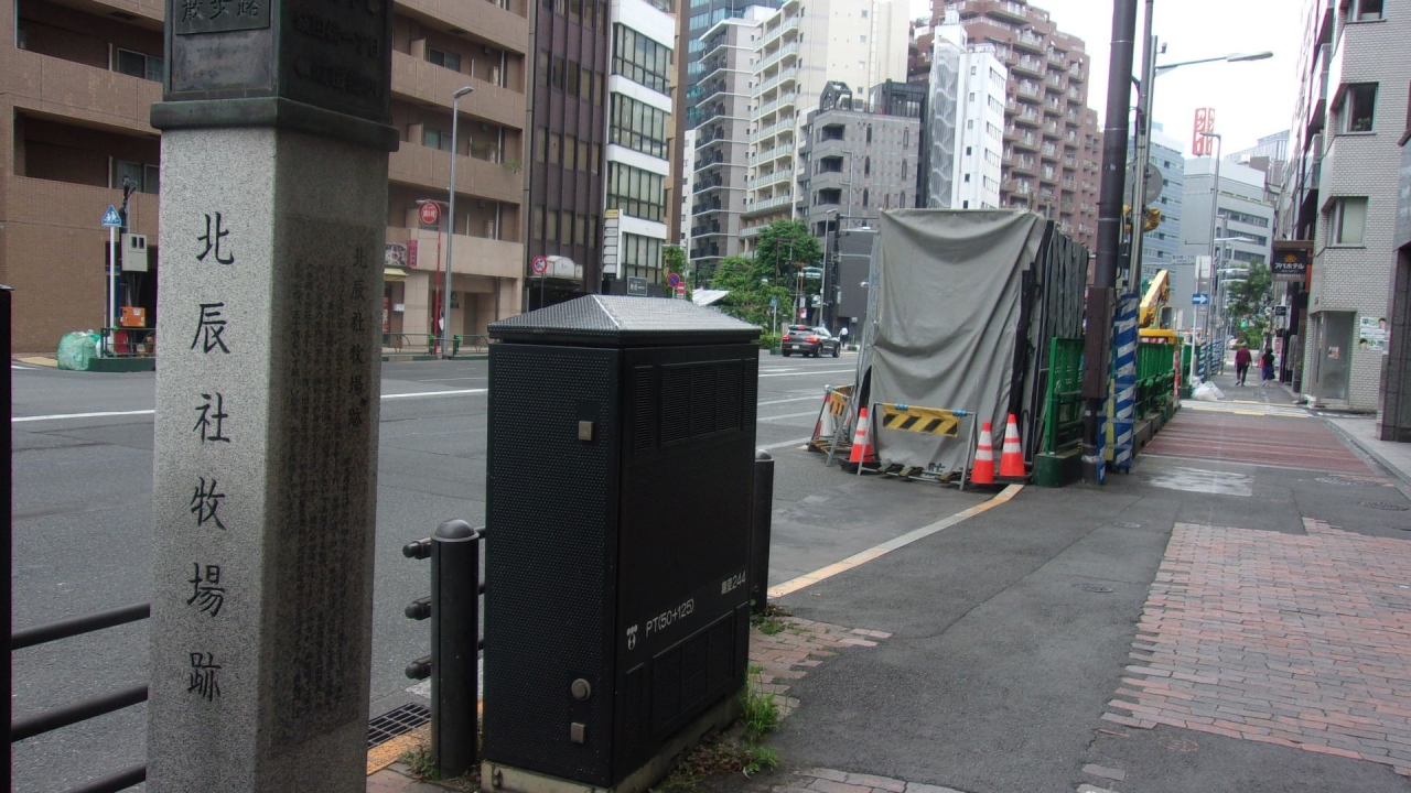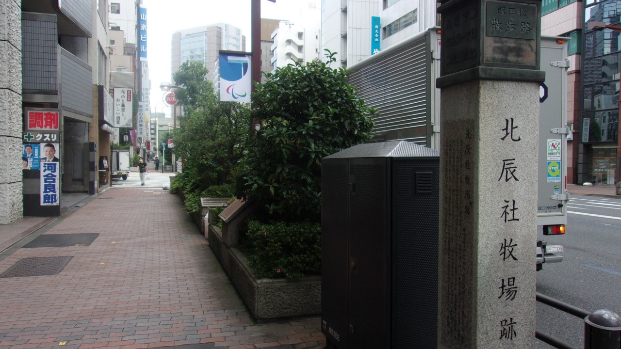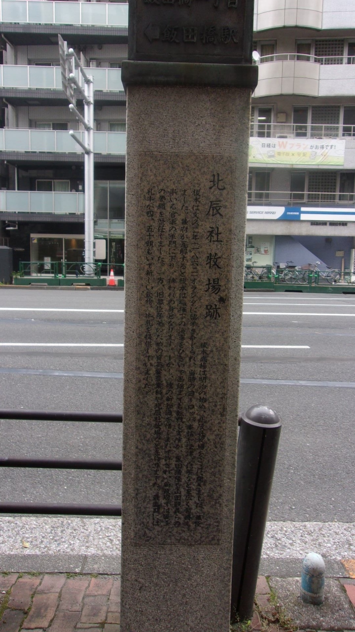 地元の飯田橋商店街振興会が、目白通りを飯田橋の散歩路にすべく、飯田橋駅から九段下駅にかけての両側歩道に石の標柱13本を建て、この町の移りかわりを示している。その中の1つの石柱がこの「北辰社牧場跡碑 」。