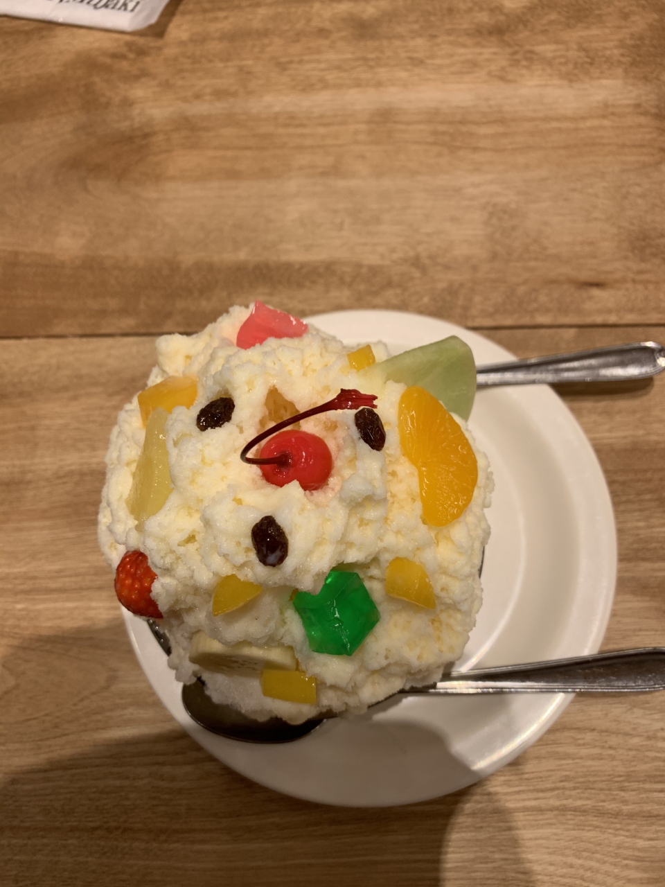 鹿児島と言えば“白熊”というぐらい、鹿児島名物のスイーツとして有名な白熊がアミュプラザの1階でも食べられます。かき氷にいろいろフルーツが入っているものですが、上から見ると白熊に見えます。食べ進みたくなる甘さです。
