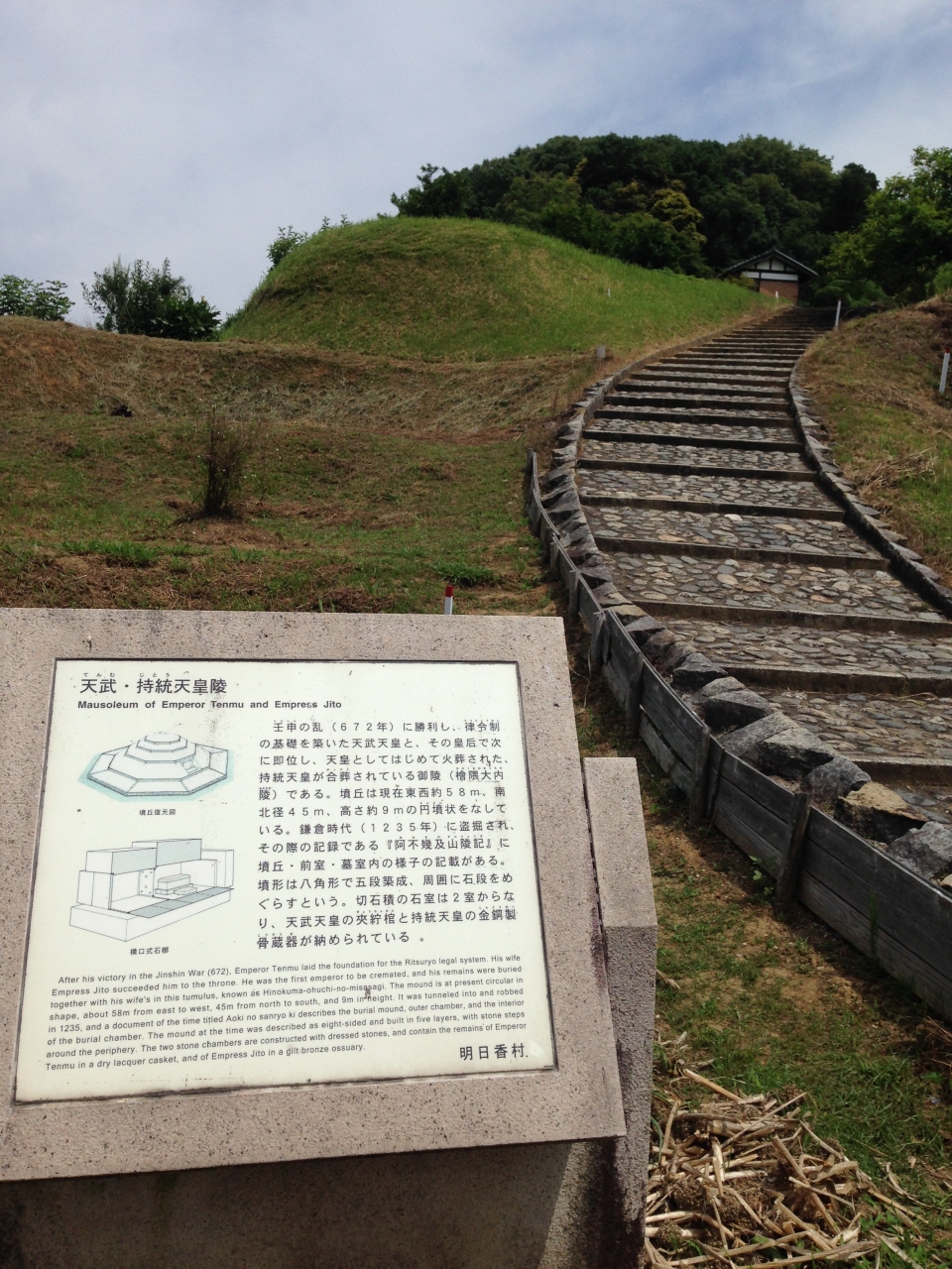 夫婦仲の良かった天武天皇とその皇后、持統天皇の合葬陵です。小高い山上にあり長い階段を上がって行きました。玄室には、天武天皇は金銅製の棺台に漆塗の木棺に、持統天皇は火葬にされて銀製の骨壺があったという事です。内部は見る事ができません。