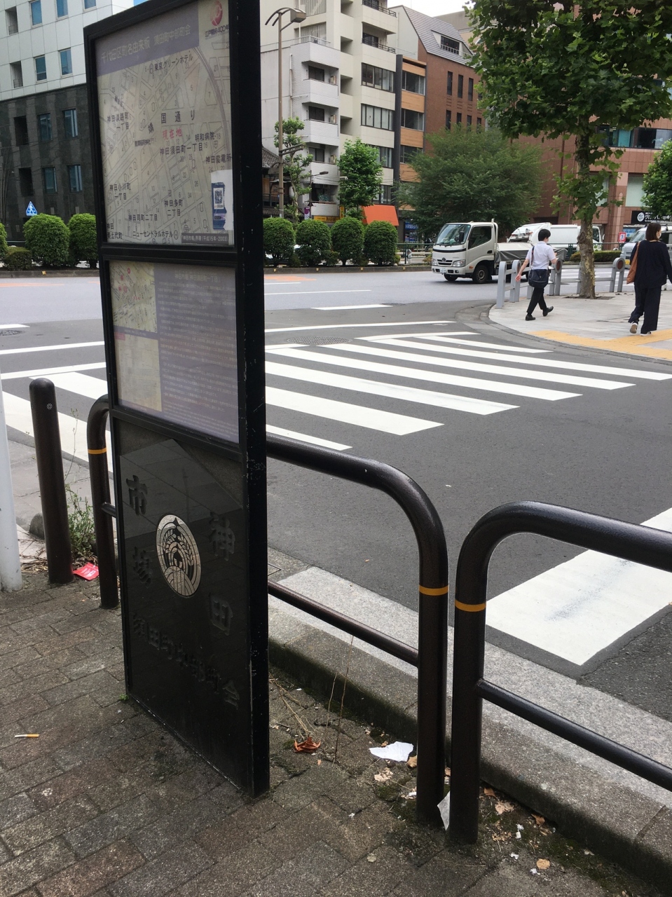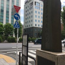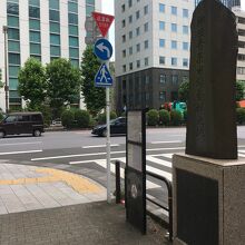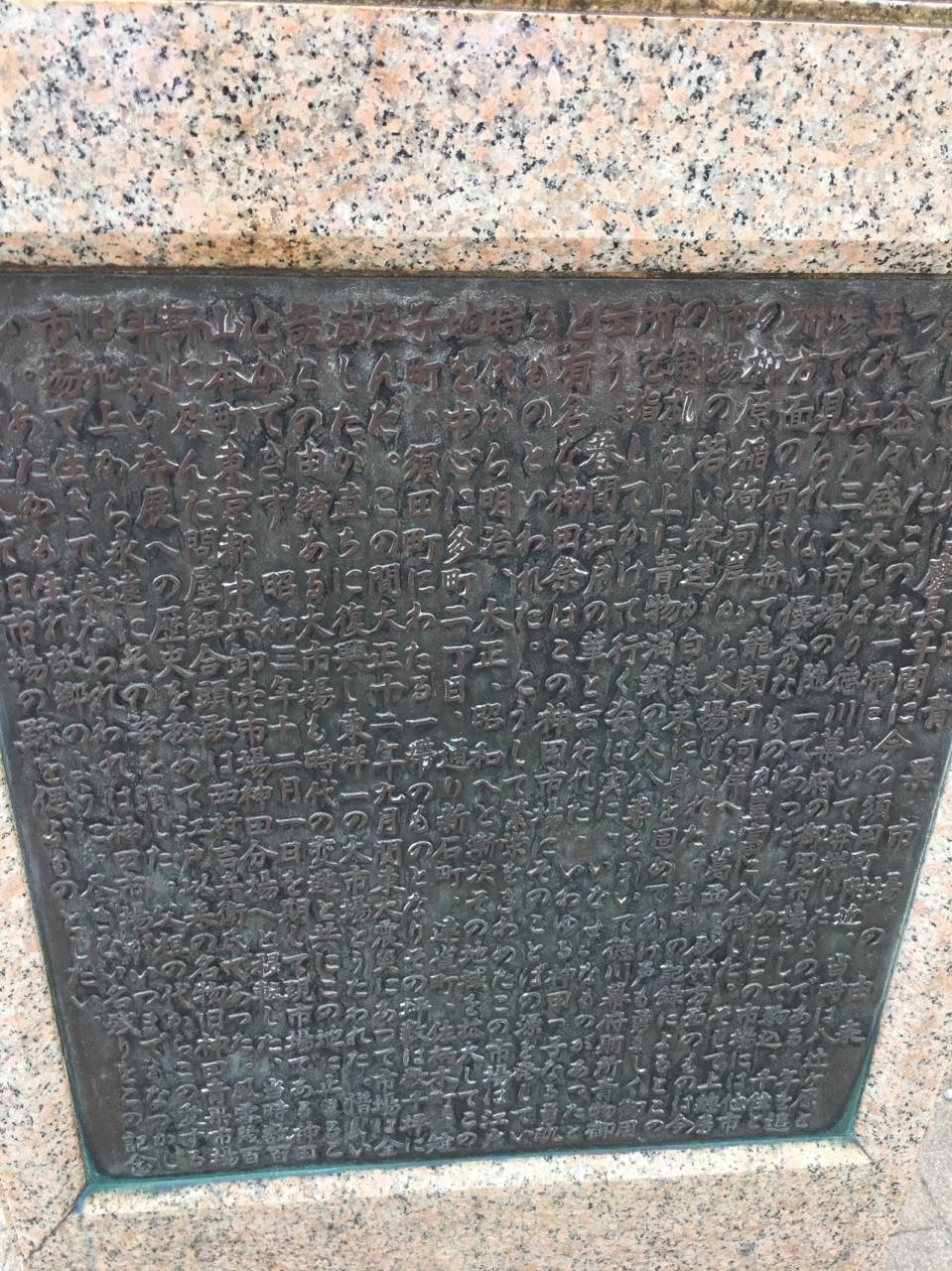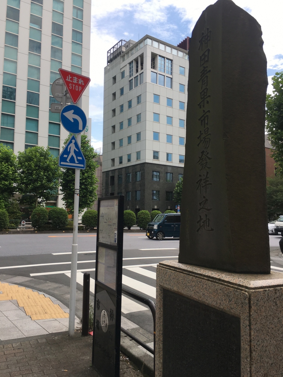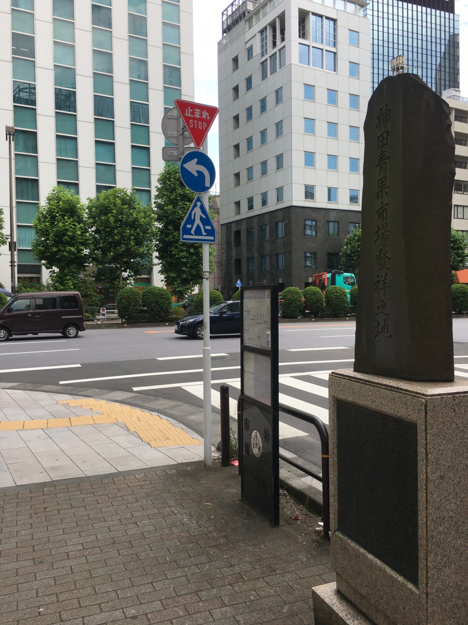 大通り沿いにに角を曲がったら長い石碑があり年季が入っていて、神田青果市場発祥の地と記載がありました。横には看板があり江戸時代の地図と現在の地図の記載もありました。江戸時代は大きな市場だったようですが今は交通量が多い通りでした。