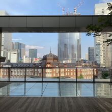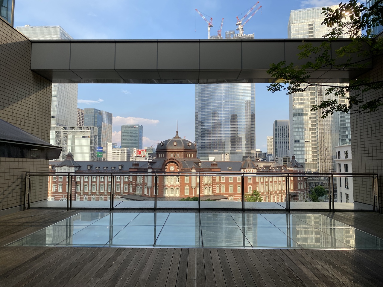 丸ビルの5階には小さいながらも屋外スペースになったテラスが存在します。ちょうど目の前に東京駅の丸の内駅舎を望むことが出来、撮影スポットとしてもおすすめです。訪れた平日の午後、テラスには誰もおらず、貸し切り状態で写真を撮ることが出来ました。柱を構図にうまく取り込めばちょっとした絵画に見えないこともないような。