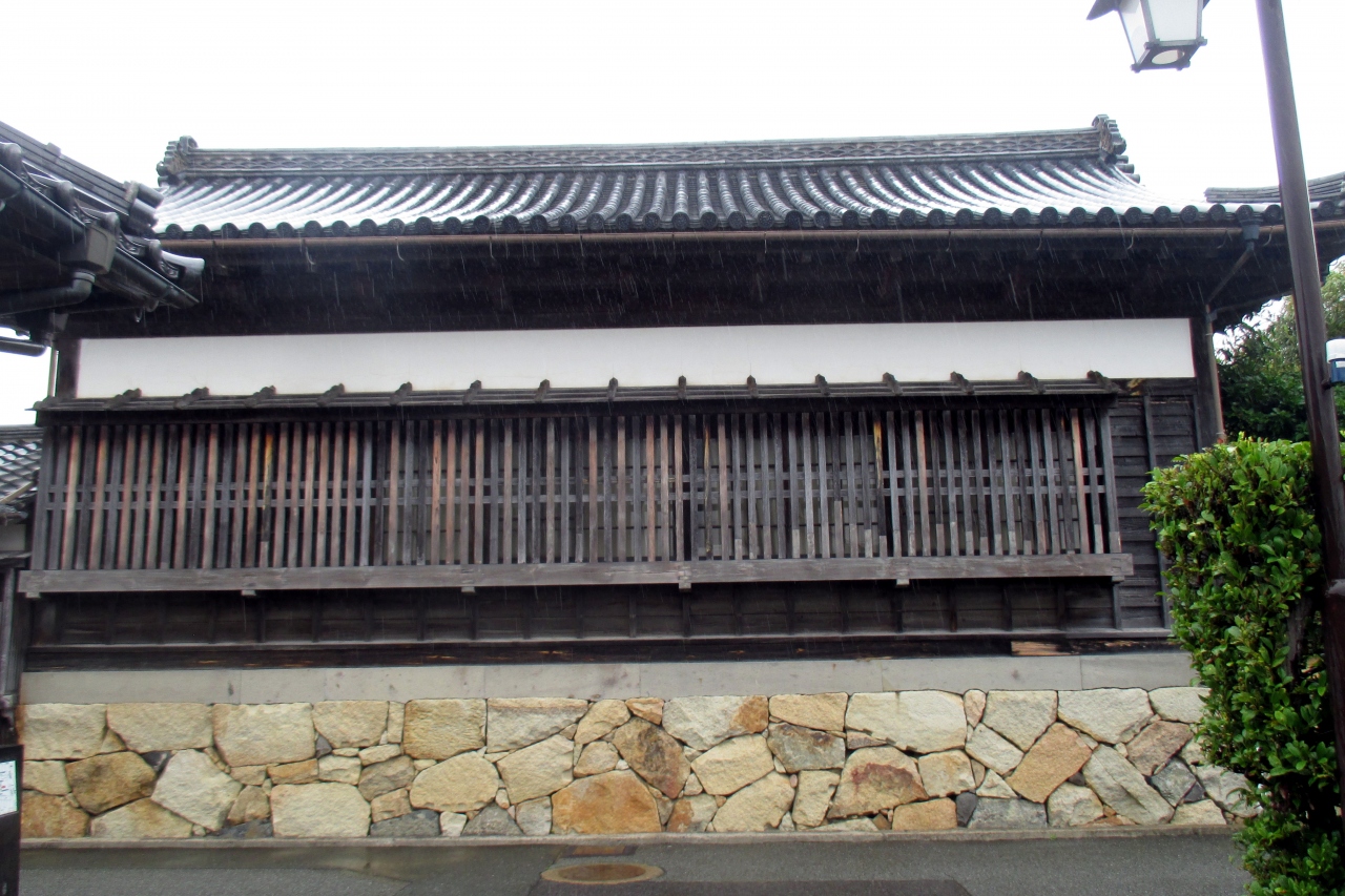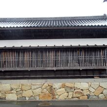 北の惣門から北の総門筋へは2回カギ型に曲がらないと行けないようになっています。2つ目の角の正面に旧益田家物見矢倉がありました。北の総門を見張りやすくするために、下に1.8mの石組があり、その上に矢倉が建っています。長い格子窓が切られています。矢倉ですから武器庫も兼ねていてと思いますが、格子窓の木の部分が大きいですから戦闘には向いていません。あくまでも物見が主目的だったのでしょう。矢倉の左には普通の高さに建屋があり、そのまた、左に門があります。
