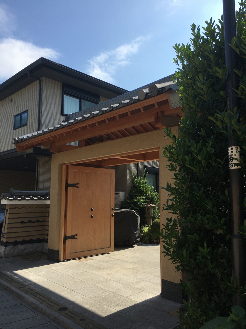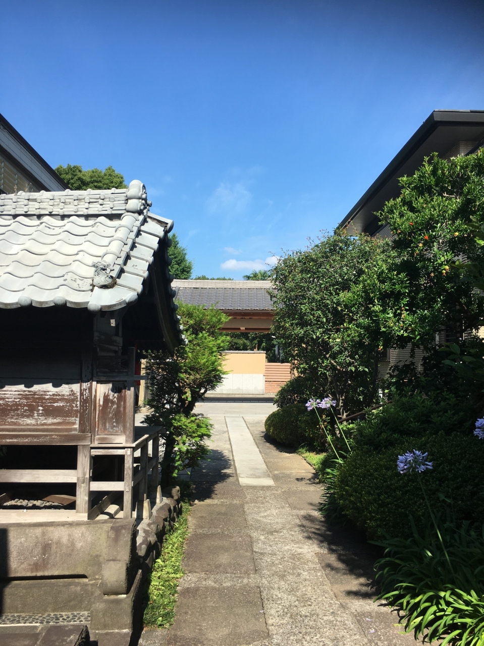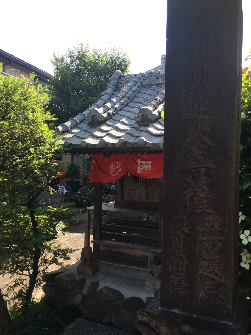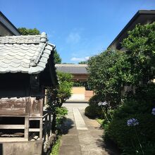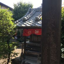 門が寺の門ぽくなく高級住居のような門構えで木の温もりを感じる門でした。横には年季入った石碑が建っていました。本殿の他に祠のような建物があり、赤い簾のようなものが目立っていました。草木が整備された境内でした。