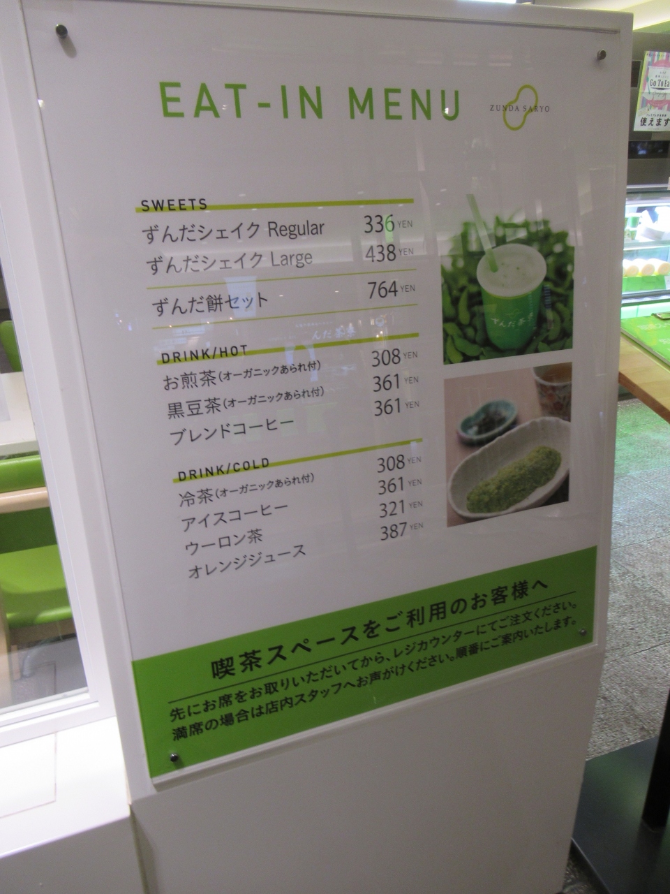 ずんだシェイクが人気のようですが、少し肌寒いような空模様だったので、奥さんはずんだ餅セット、わたくしは黒豆茶を頂きました。