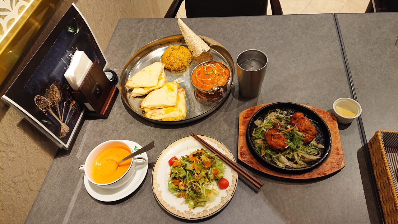 ハロウィーンの時期限定のハロウィーンセットを注文して食べました。パンプキンチーズナンやエビカレー、トマトスープ、サラダ、マンゴーラッシーのセットでしたが、パンプキンチーズナンは、少し脂っこい感じだったので、シンプルなプレーンの方が良かったと思いました。