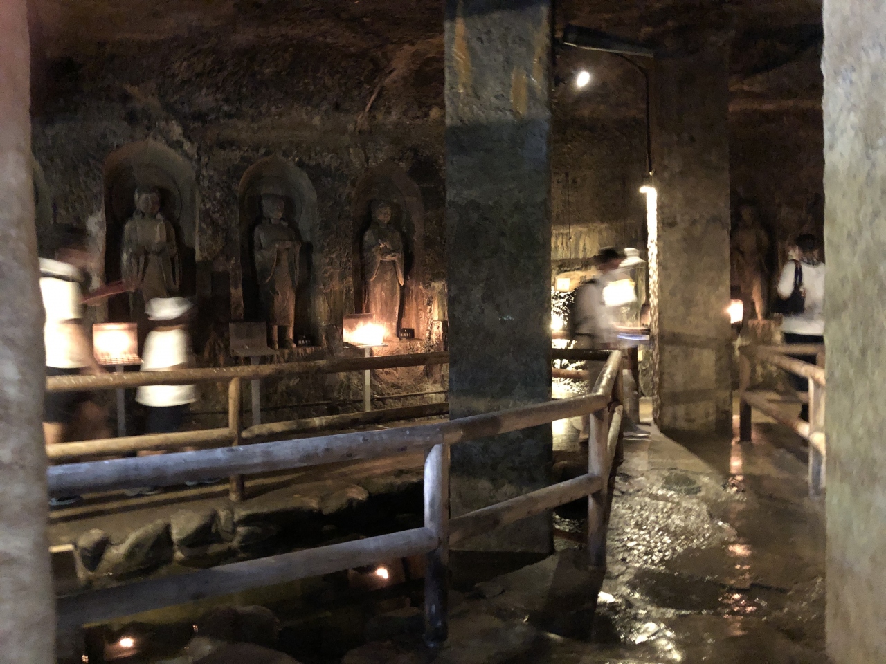 長谷寺の山門の先、書院の手前に鳥居が建つ洞窟があります。洞窟の入口でロウソクに火をつけ(箱にお金を入れて)、それを持って薄暗い洞窟の中を歩き、洞窟内の石像(壁面彫刻)の前に、ロウソクを納めます。天然の洞窟の中はひんやりとしていて、見ごたえのある石像が並んでいます。