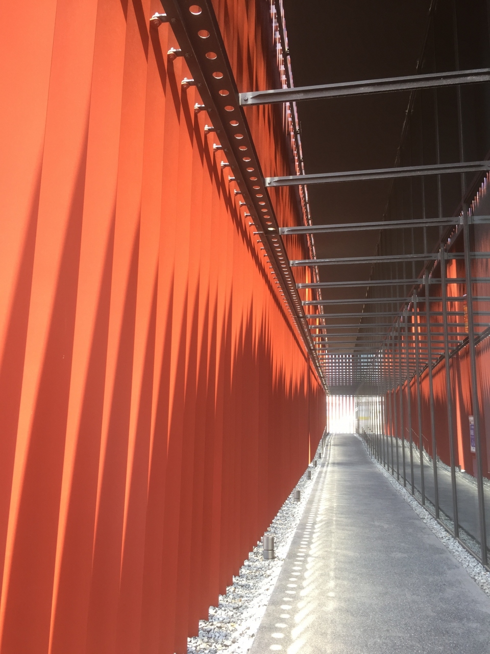 赤いのれんのようなカーテンのようなデザインが目を引く建物。