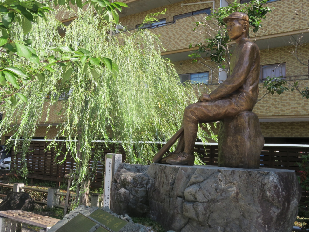 放生園の片隅にある像でみてみると正岡子規の像と。バットを持ち野球の恰好をしていたので正岡子規のイメージとは違って本当に正岡子規の像なのかと思ってしまいました。若いころに野球に熱中し、松山で野球を広めたようでこのような像になったそう。初めて知りました。