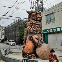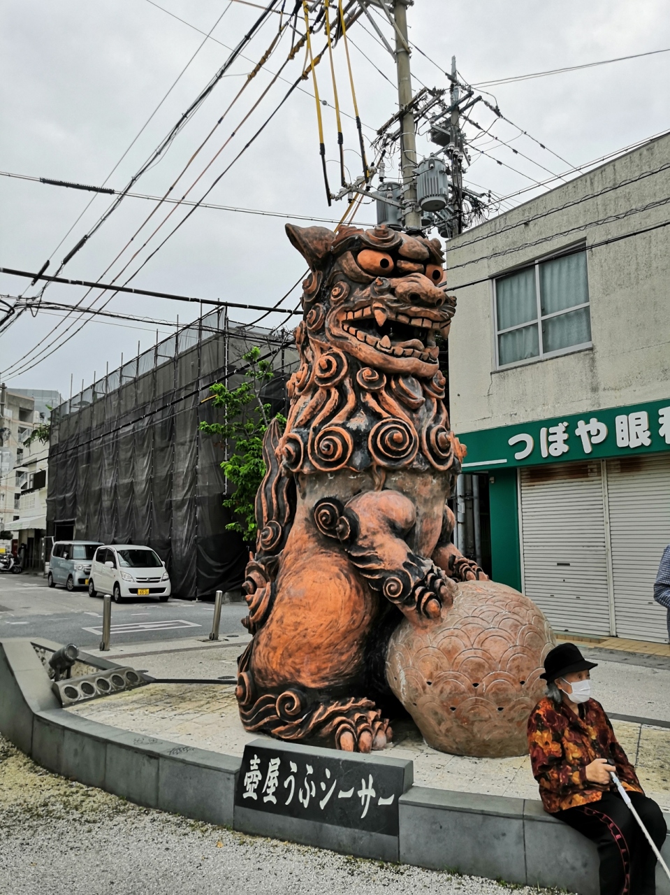やちむん通りの西側の入口近くにあります。2匹で1対になって家を魔物から守る役割がありますが、こちらのシーサーはさいおんうふシーサーとほぼ同じサイズで対になっています。この数時間前にさいおんうふシーサーを見ていたので、あまり見た目のインパクトは少なかったです。