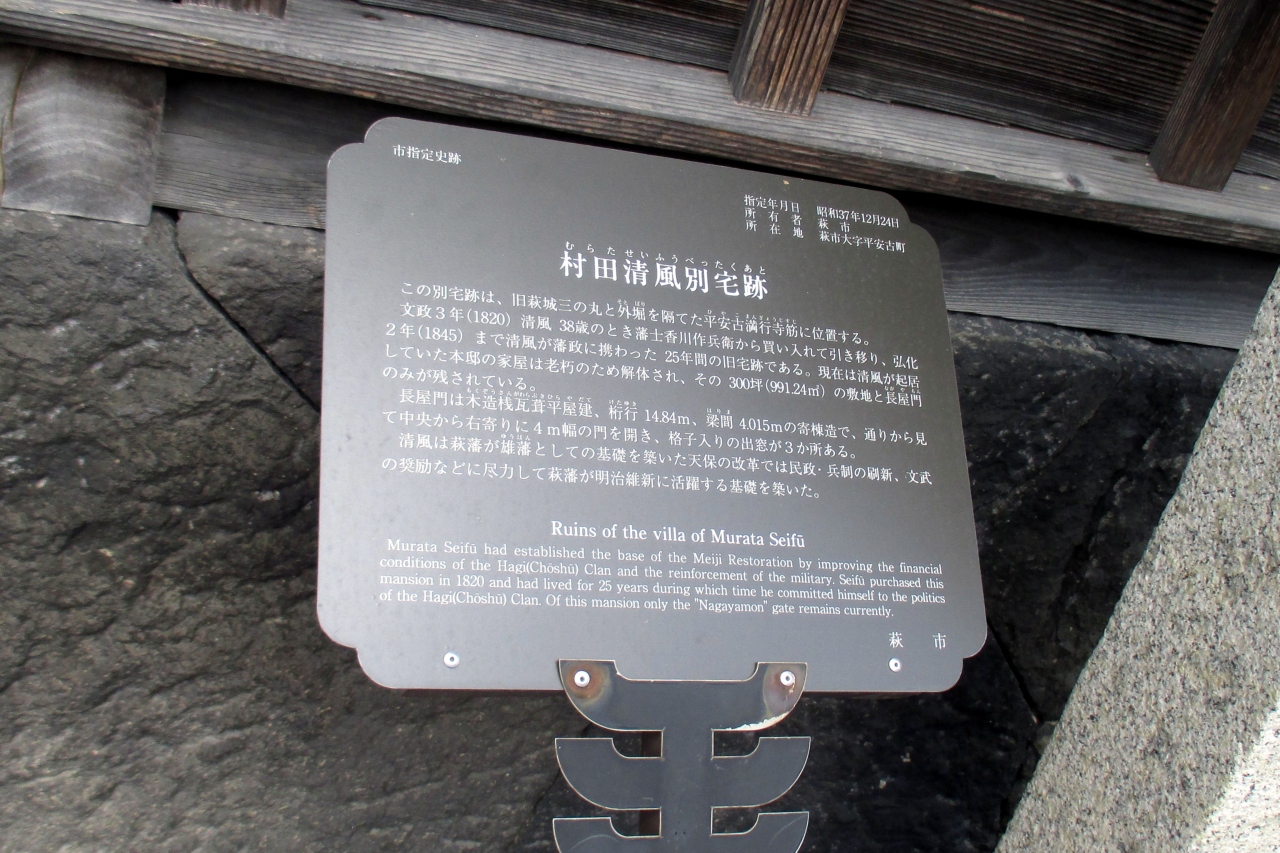 村田清風別宅跡には一見の価値のある立派な門がありました。ここを訪れる前に、長門の方に村田清風記念館に寄ったので、清風の人となりをお勉強させてもらいました。幕末期に、破綻していた藩の財政改革を断行した人物ですね。これがなければ、長州藩が維新で活躍出来る財政的基盤がなかった訳ですから、その後の維新の行方もどう変わっていたか分りませんね。