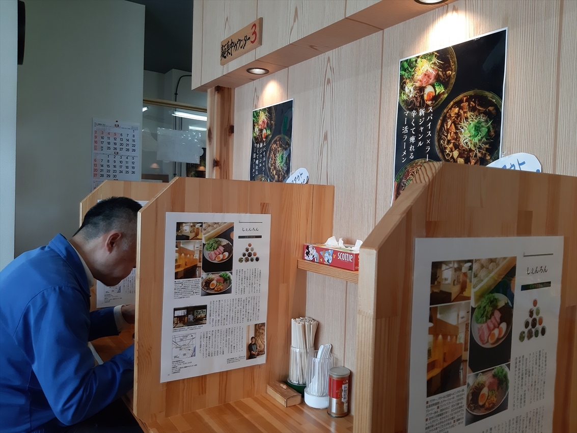しぇんろんバードのカウンター席は一人ずつに区切られていますが、コロナ対策のためではなく、以前からこういう造りの麺集中カウンターなんだそう。