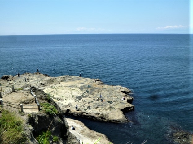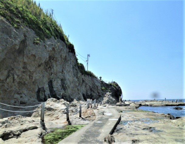 稚児ケ淵は海蝕台地/背後の断崖絶壁!