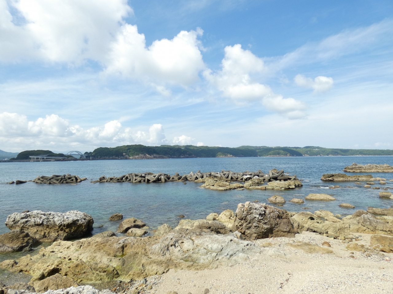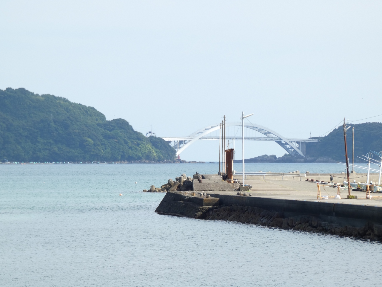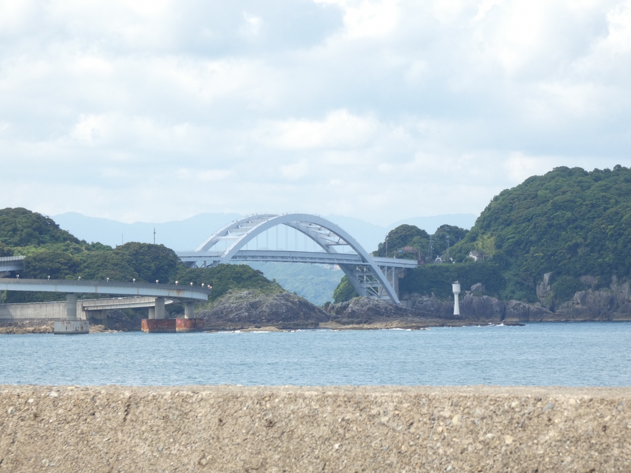 本州最南端の潮岬と紀伊大島を結ぶ大橋。平成11(1999)年に開通した架橋で、290mのアーチ橋と苗我島に架かる386mのループ橋からなっています。海に浮かぶ白色の橋梁が大変美しい姿を見せてくれます。橋を渡った紀伊大島には樫野崎灯台やトルコ記念館もあり観光で訪れたい場所です。