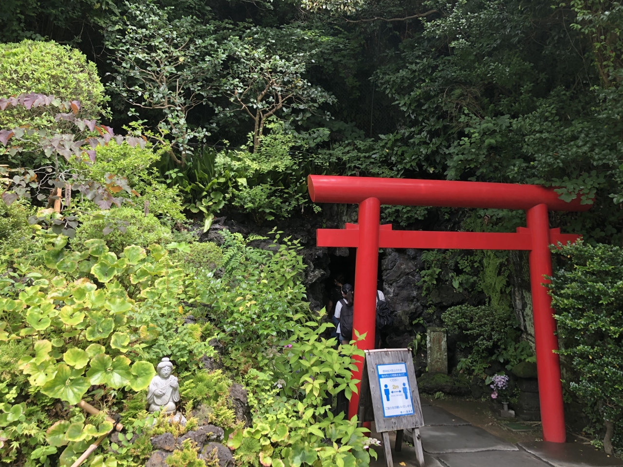 長谷寺の書院の手前、赤い鳥居の先に洞窟の入口があります。かつて、弘法大師がここで祈願をしたと伝えられています。洞窟の中には、出世弁財天と、これに仕える十六童子などが、洞窟の通路に沿って、壁面に彫刻されています。