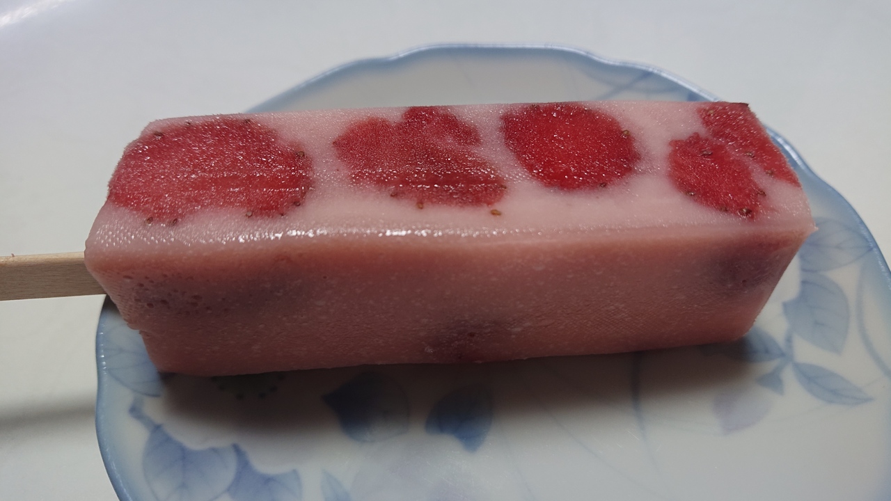 6月下旬に訪問。時季的にも暑くなってきていることから、葛を凍らせたお菓子である、くずバーを購入。お味は以前食べておいしかった印象のある、いちごミルク味を選択しました。お味の方は、ミルクは脇役に徹しており、イチゴの味が中心という印象でしたが、おいしくいただけました。