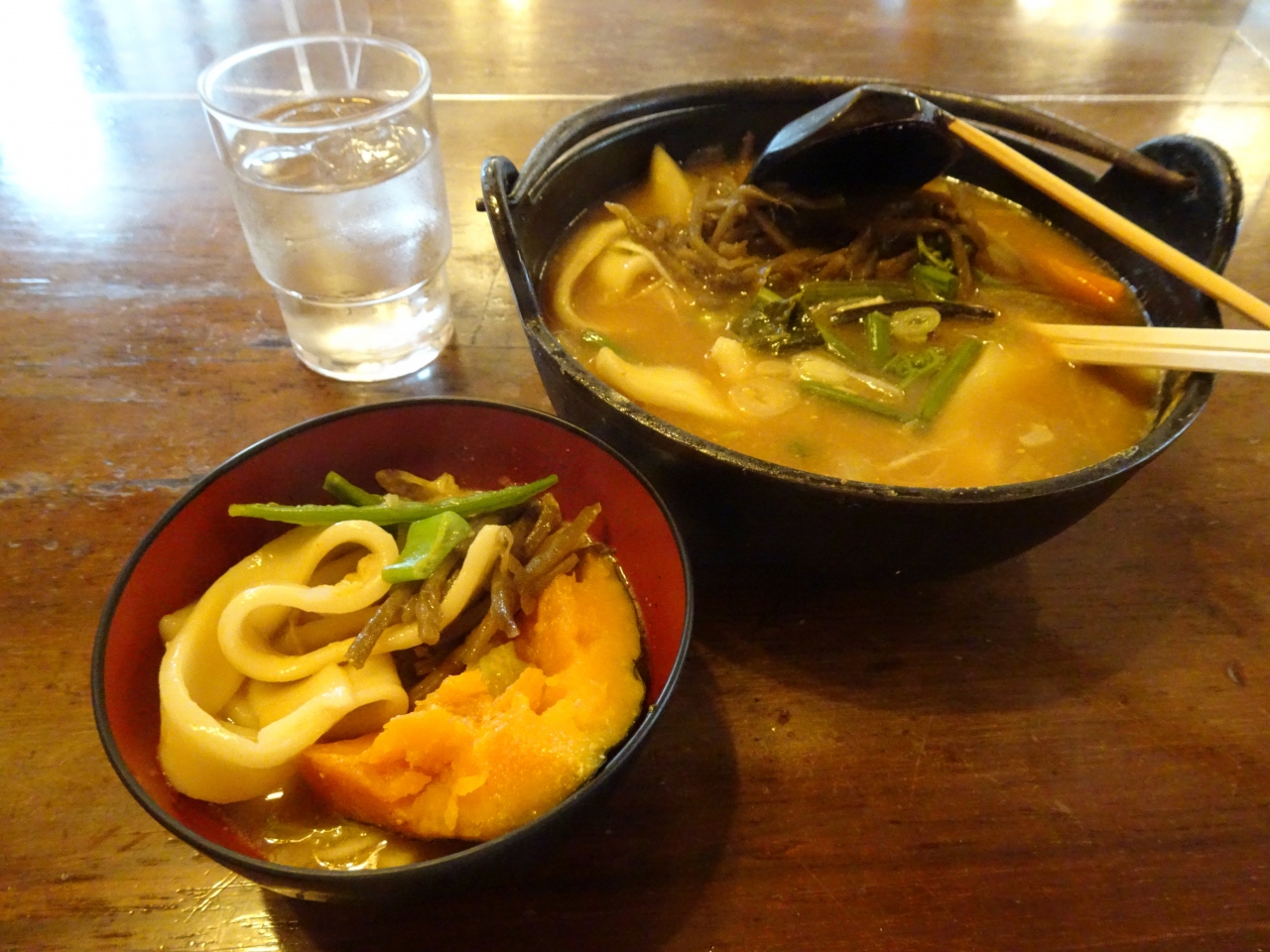 大き目に切ったホクホクのかぼちゃ、ジャガイモ、里芋、ニンジン、ゴボウ、白菜など 野菜が盛りだくさんで、しかもボリューム満点。