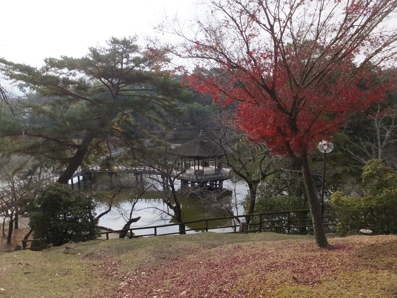 荒池の上流がわ、春日大社の境内を流れてくる小川を集めてせきとめた小さな池です。林の中に浮御堂のある雰囲気のいい池です。浮見堂も入ることができます。周囲には散歩道もあります。飛火野の方からはかなりの段差があって降りていく感じです。春日大社に行く時、行きは参道でしょうが、帰路はこの池の畔を散歩しながら興福寺まで降っていくのも風情が変わっていいと思います。なお、訪問時は残念ながら鷺は見当たりませんでした。