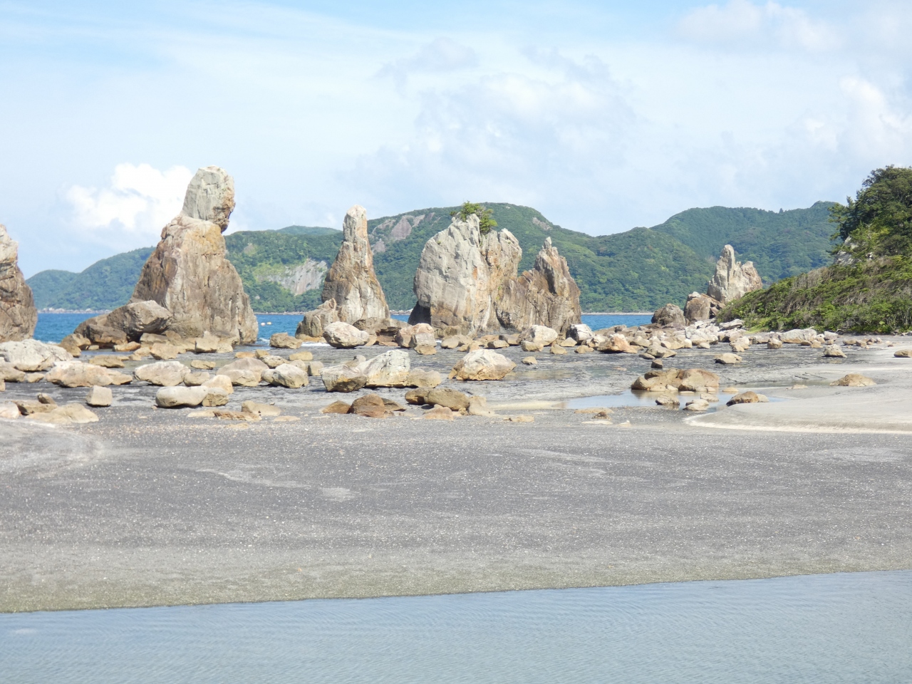 串本の海岸で紀伊大島に向かい海中に約850mの列をなす大小40の岩柱がそそり立っています。規則的な並び方が橋の杭に似ていることから名付けられたそうです。吉野熊野国立公園に属する場所で国の名勝天然記念物に指定されています。奇岩の集まりで素晴らしい景観です。