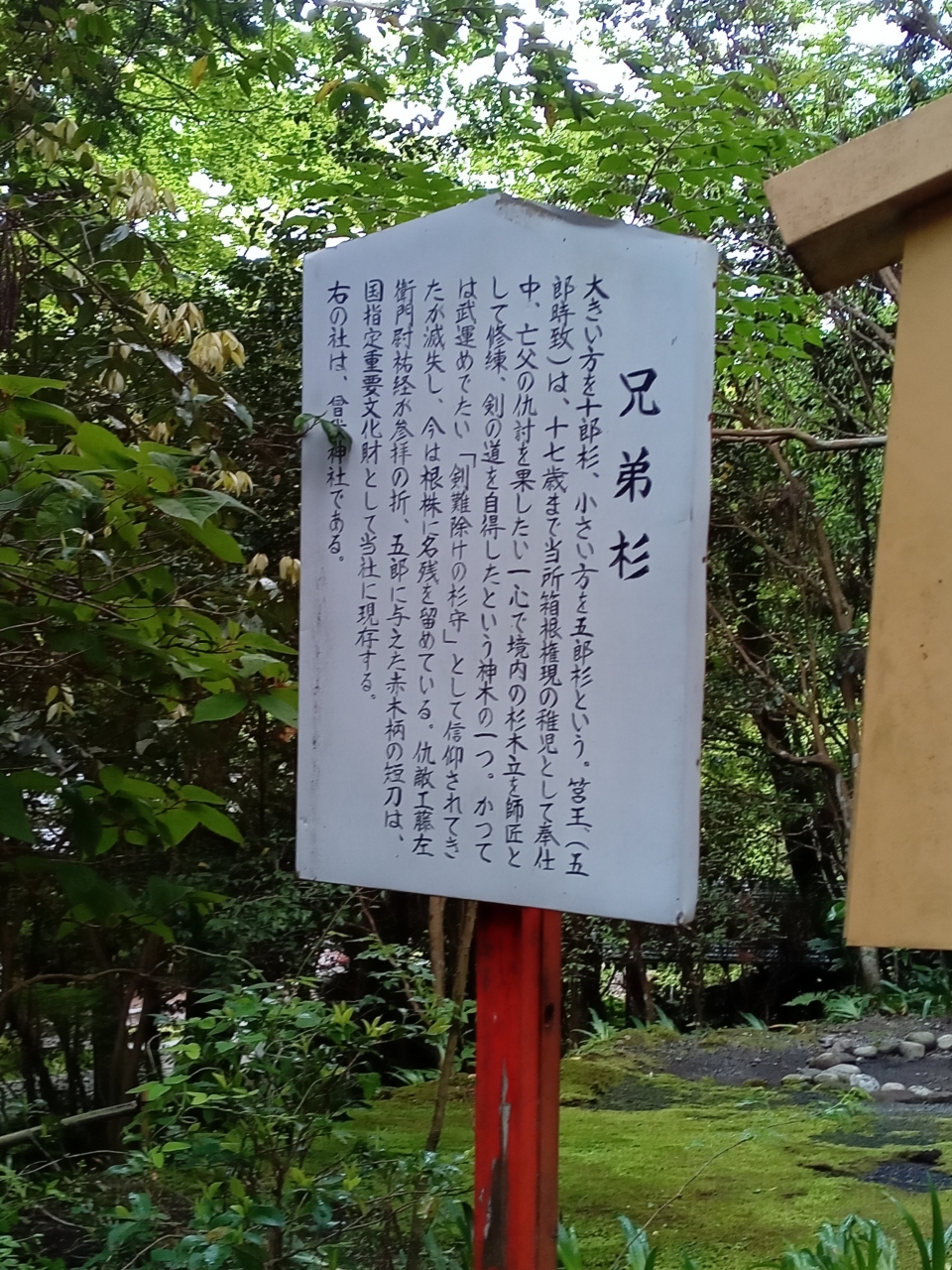 箱根に御鎮座されていらっしゃる箱根神社の参道に「曽我神社」がありますが、曽我神社の前の参道脇には、「箱根兄弟杉」がありました。箱根兄弟杉は、五郎が稽古に励んだ杉だそうです。今まで気に留めずに歩いていました。