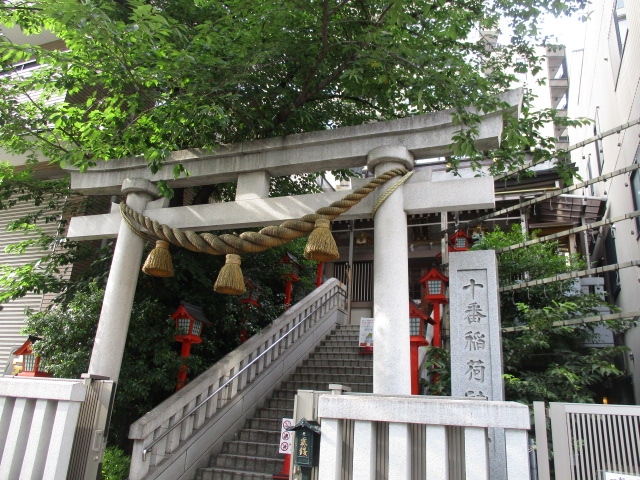 地下鉄大江戸線麻布十番駅7番出口の真上に港七福神「宝船のおやしろ」と親しまれている十番稲荷神社に直ぐ着きました。十番稲荷神社の境内にたくさんのカエル親子の像がありました。「若がえる」「忘れ物がかえる」ご利益があるとのことでユニークで面白い神社です。厄除けや商売繁盛にご利益があるとのことです。 左側に港七福神の宝船石像がありました。十番稲荷神社前は駅チカで待ち合わせ場所に最適です。