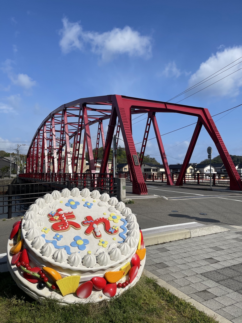 外の赤い橋と、まれのケーキの前で写真撮影は映えマストでしょう。