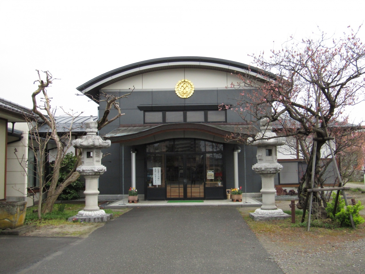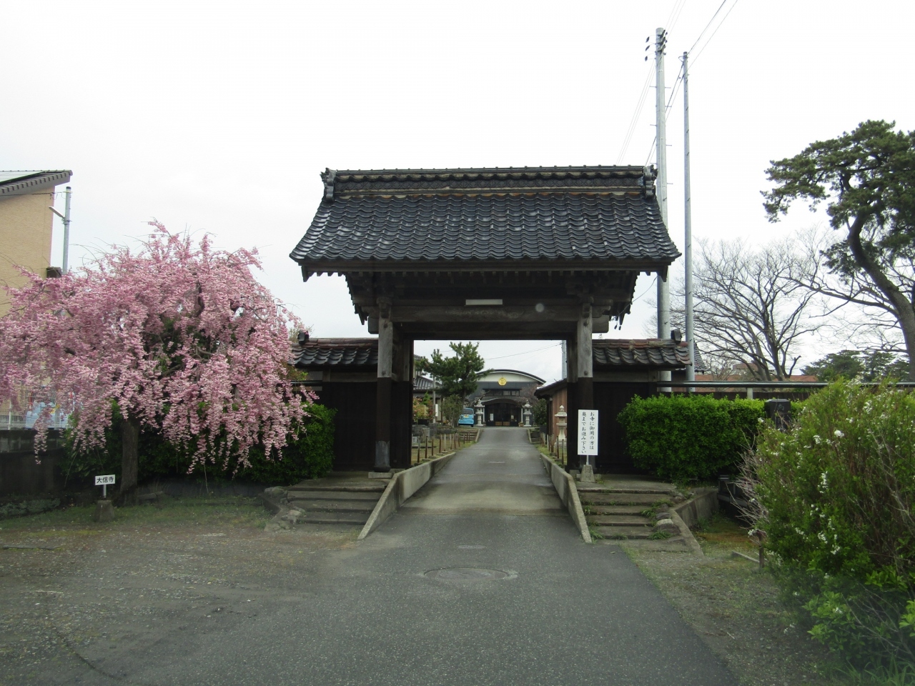 山門横にある桜がちょうど見頃でしたが、他には新しい本堂のみであまり見所はないかな、と思っていたところちょうど住職さんがいて、本尊の阿弥陀如来を拝観させて頂いた後、大信寺の由来のほか、本堂は長らく地震により倒壊したままだったが平成10年にようやく再建できたこと、境内にある墓碑は船の沈没による乗組員のものや地元酒田の名士のものが多いことなど、親切に教えて頂き、帰りに「法語カレンダー」も頂きました。