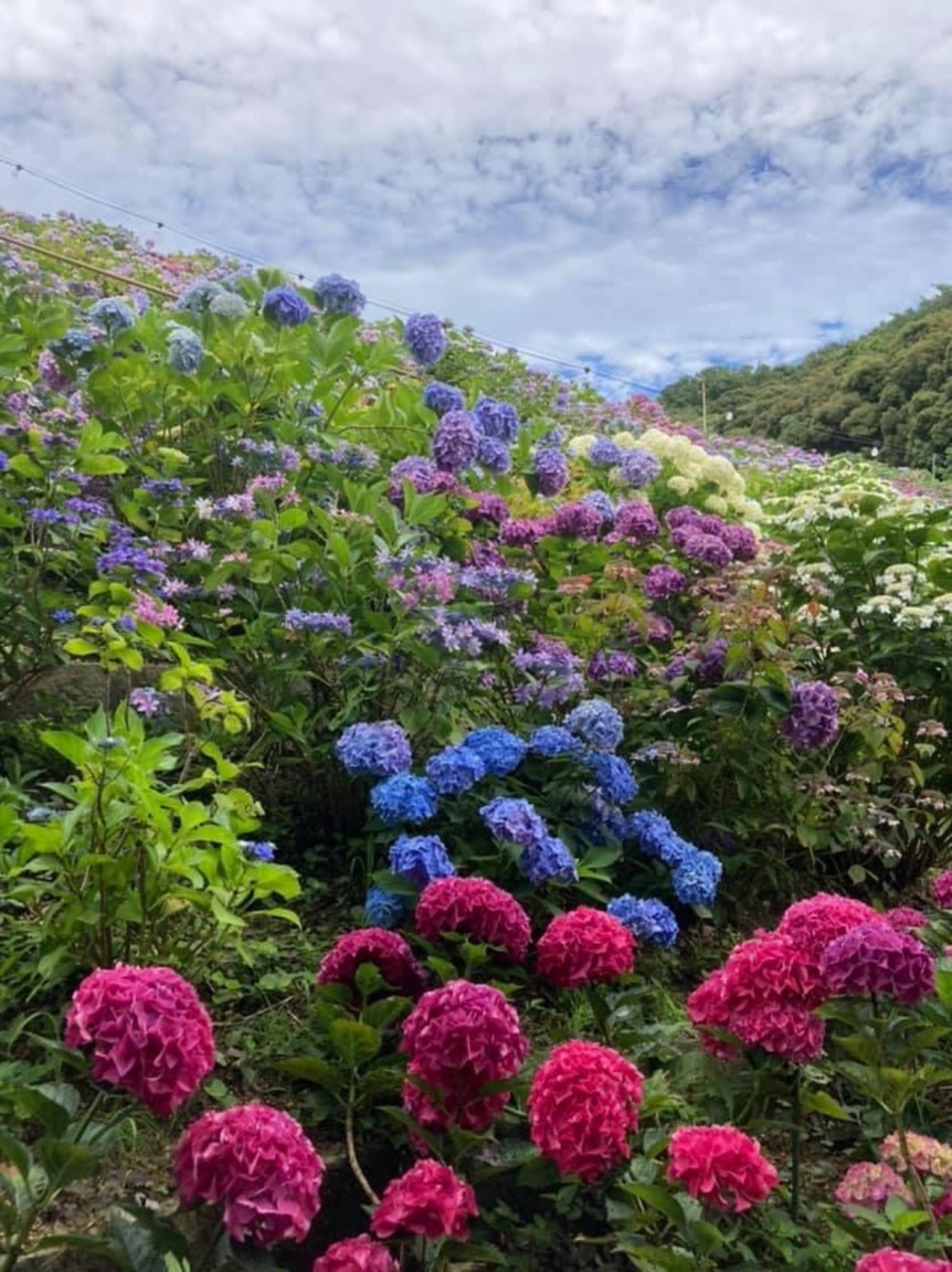 いろんな種類の紫陽花が現在見頃になっています。このようにいろんな種類の色が一気に咲く場所もとても珍しいなと思っています。土壌がどういう風になっているのか気になります。広い敷地内に紫陽花が見事な咲き具合です。