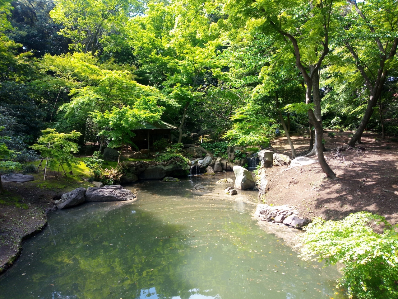 六義園に、5月の連休時に訪れ、新緑と満開のツツジの花がとてもきれいでした。つつじ茶屋周辺の景色は、添付写真のようできれいでした。個人的には、秋の紅葉時のほうが景色はずっと素晴らしかったことを覚えています。