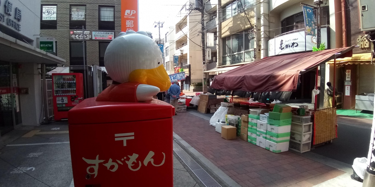 添付写真のように、巣鴨のゆるキャラのすがもんが、巣鴨地蔵通り商店街の郵便ポストにあって、大感動しました。この巣鴨地蔵通り商店街 沿いには、ぬいぐるみのような「すがもんのおしり」もあって、クッションみたいな感触でした。