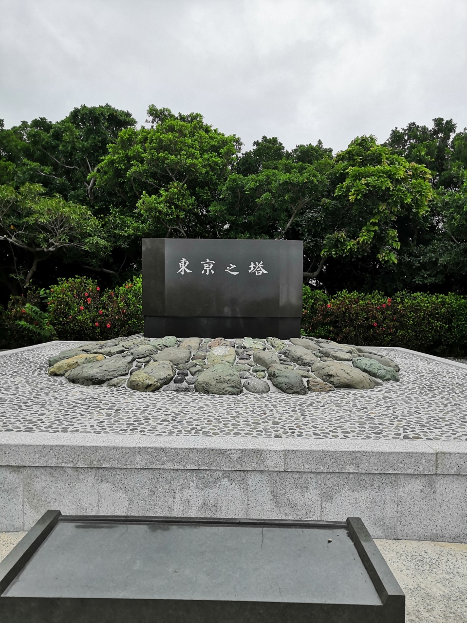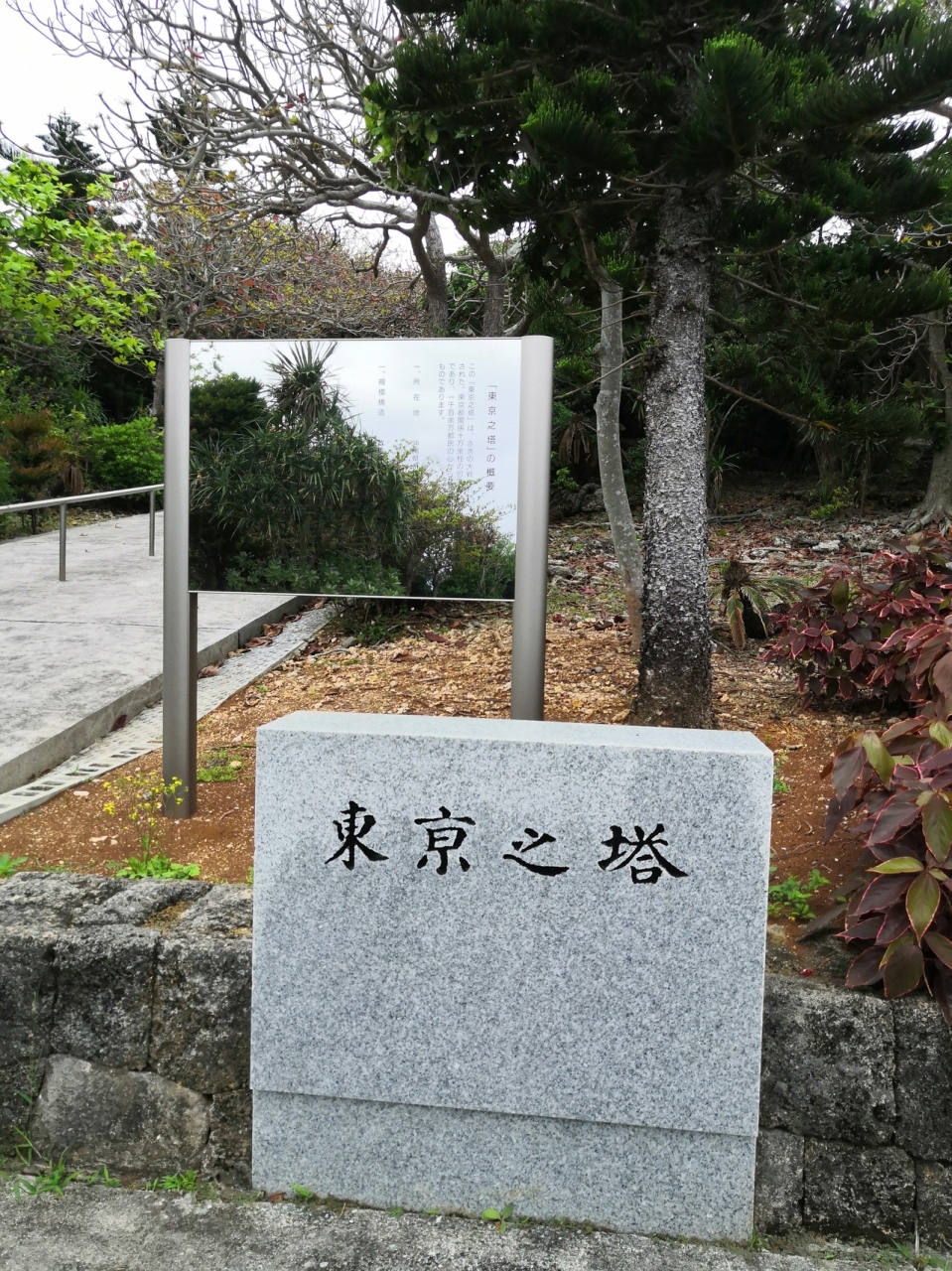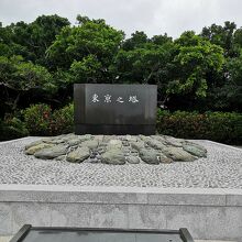 沖縄にある都道府県別の戦没者慰霊碑のうちの一つで、平和創造の森公園の東側にある米須霊域の一角にあります。戦没した東京都関係者10万有余柱の御霊を慰める場所で、さすがに東京というか面積は最大だそう。遺族代表が多摩川で採取した小石を敷きつめてあるのが東京とのつながりですかね。