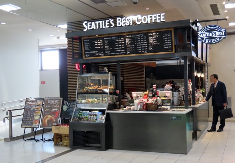 鹿児島中央駅の新幹線の改札の中にあるシアトルズベスト。店舗としての仕切りはなく、待合スペースとしても利用できるスタイルです。九州新幹線はけっこう頻繁に発着しており、長い時間過ごすこともなさそうですが、ふとコーヒーでもと思ったらテイクアウトして車中で楽しんでもOKなので便利。