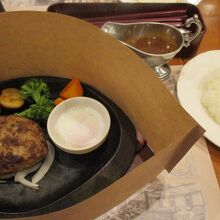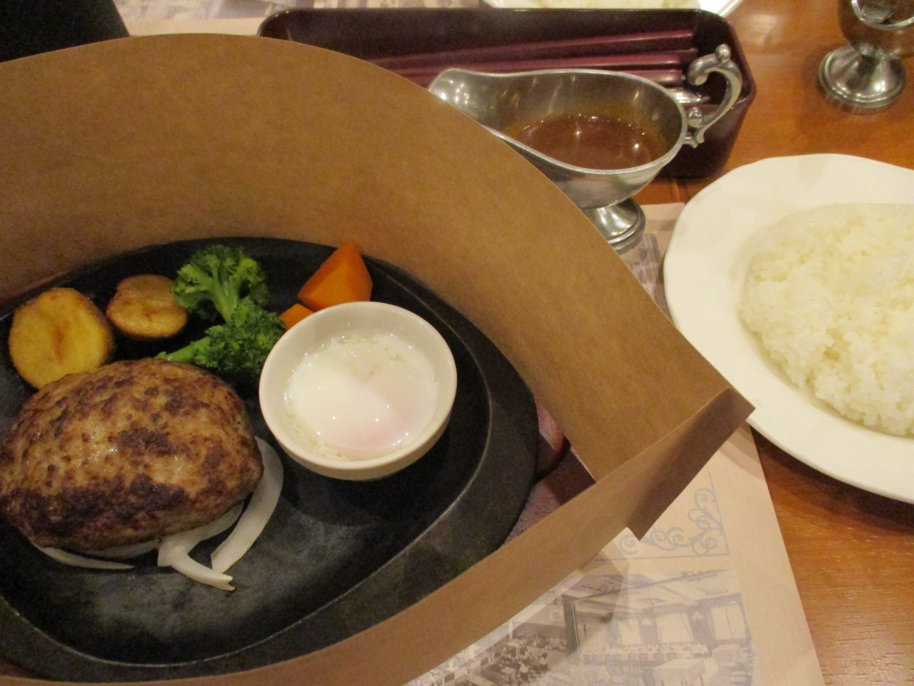 新京極通り商店街にある、大きなオムレツのオブジェが目立つ洋食レストランです。ランチで行きました。店内に入ると、壁や、紙のマットにお店の歴史が紹介されていて、老舗のお店だったんだなあと思いました。迷った末ハンバーグを注文しました。熱い鉄板の上にのって出てきました。別添えのハンバーグソースは銀色の懐かしい形の入れものに入っていました。