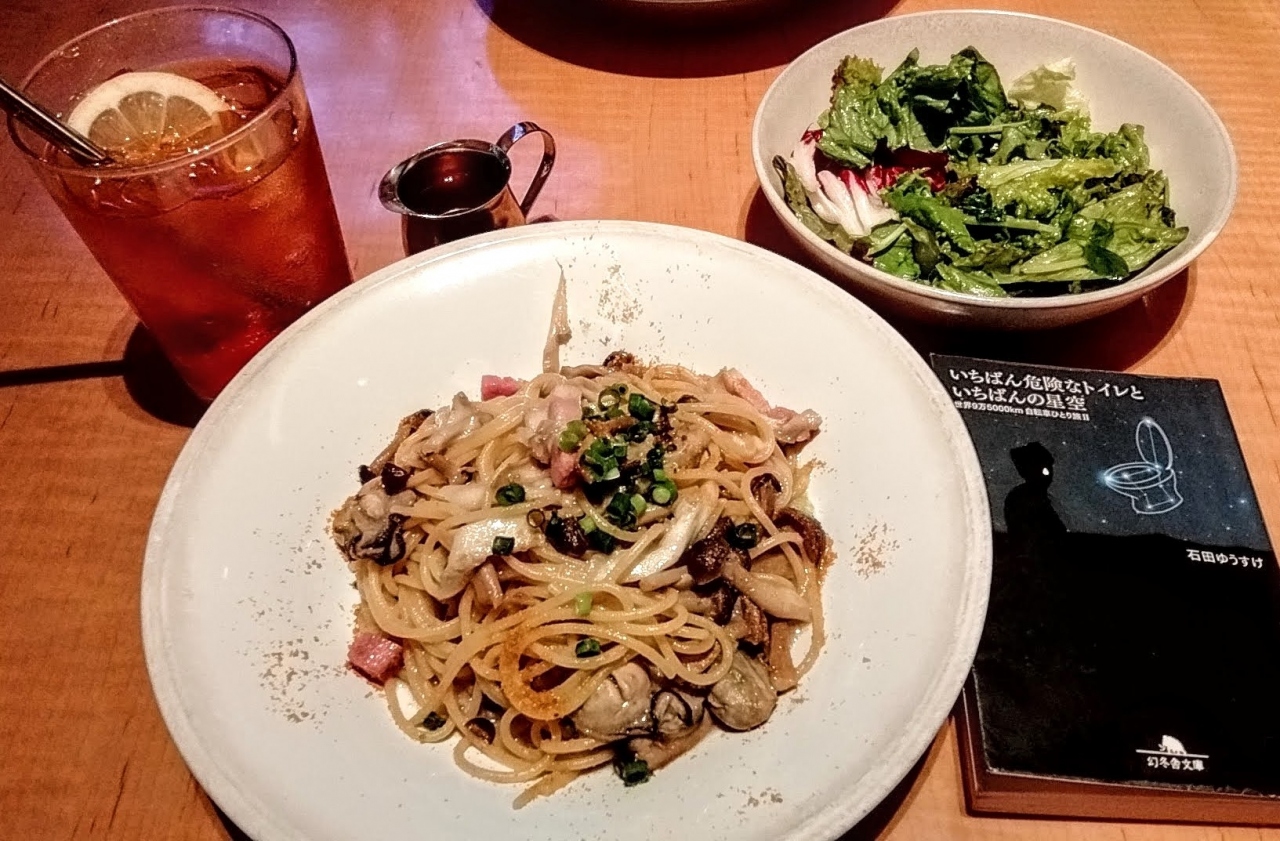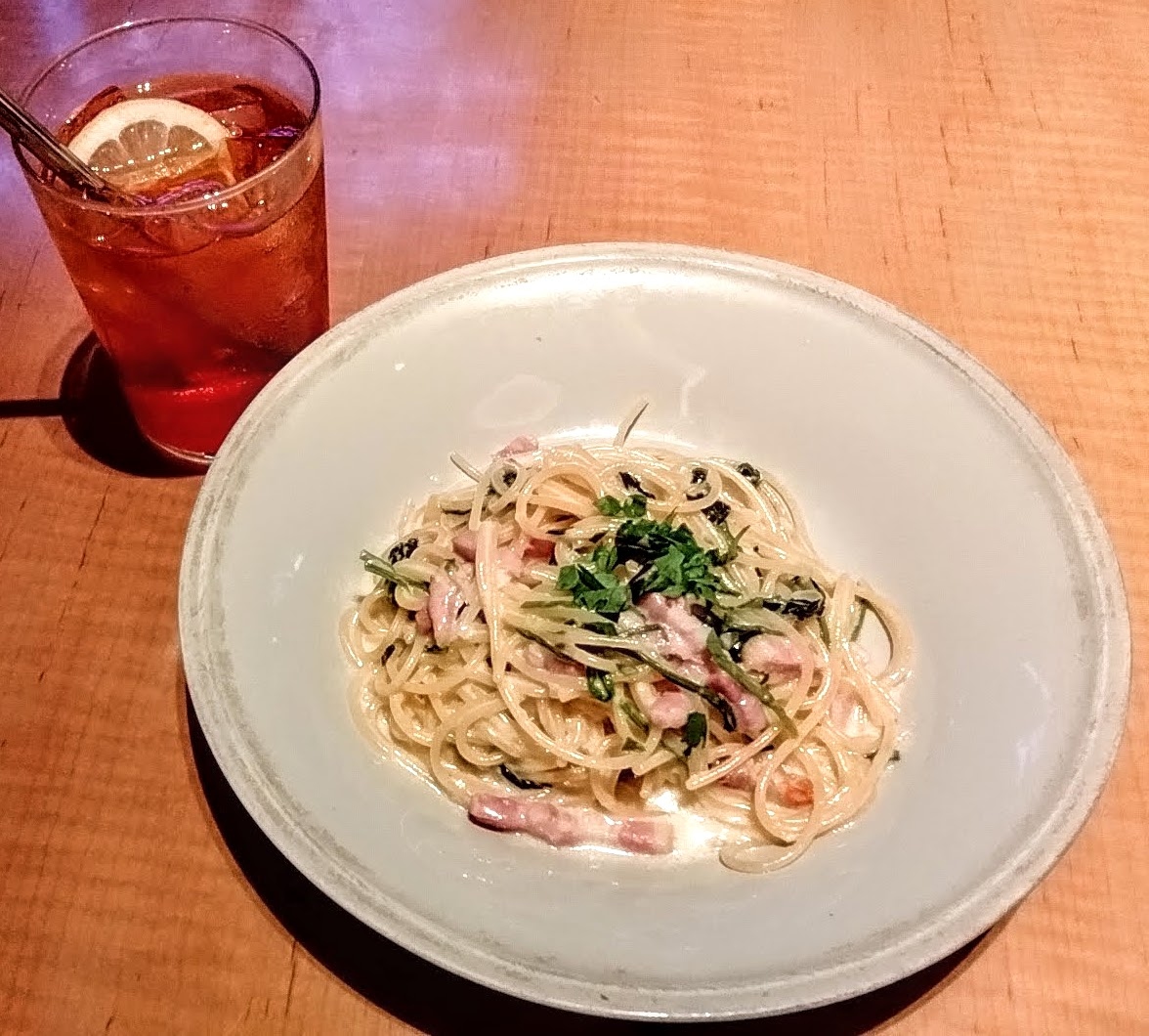 2フロア、200席以上もある広い店舗で、席の間隔にも余裕があり、安心して食事ができます。ステーキなどの肉ランチ、サラダランチ、ピザランチ、パスタランチとメニュー数も豊富です。パスタ自体も希望すれば選べるようで、グルテンフリーペンネや、シチリアのパスタのカサレッチェまでありました。基本的には、それぞれのソースに一番合うパスタを使って提供されます。真牡蠣のペペロンチーノ、カラスミかけランチ、無添加ベーコンの無農薬レモンクリームソースパスタをいただきました。レモン皮の苦みと香りがさわやかな濃厚クリームソースでした。セットドリンクは、お代わり自由でした。