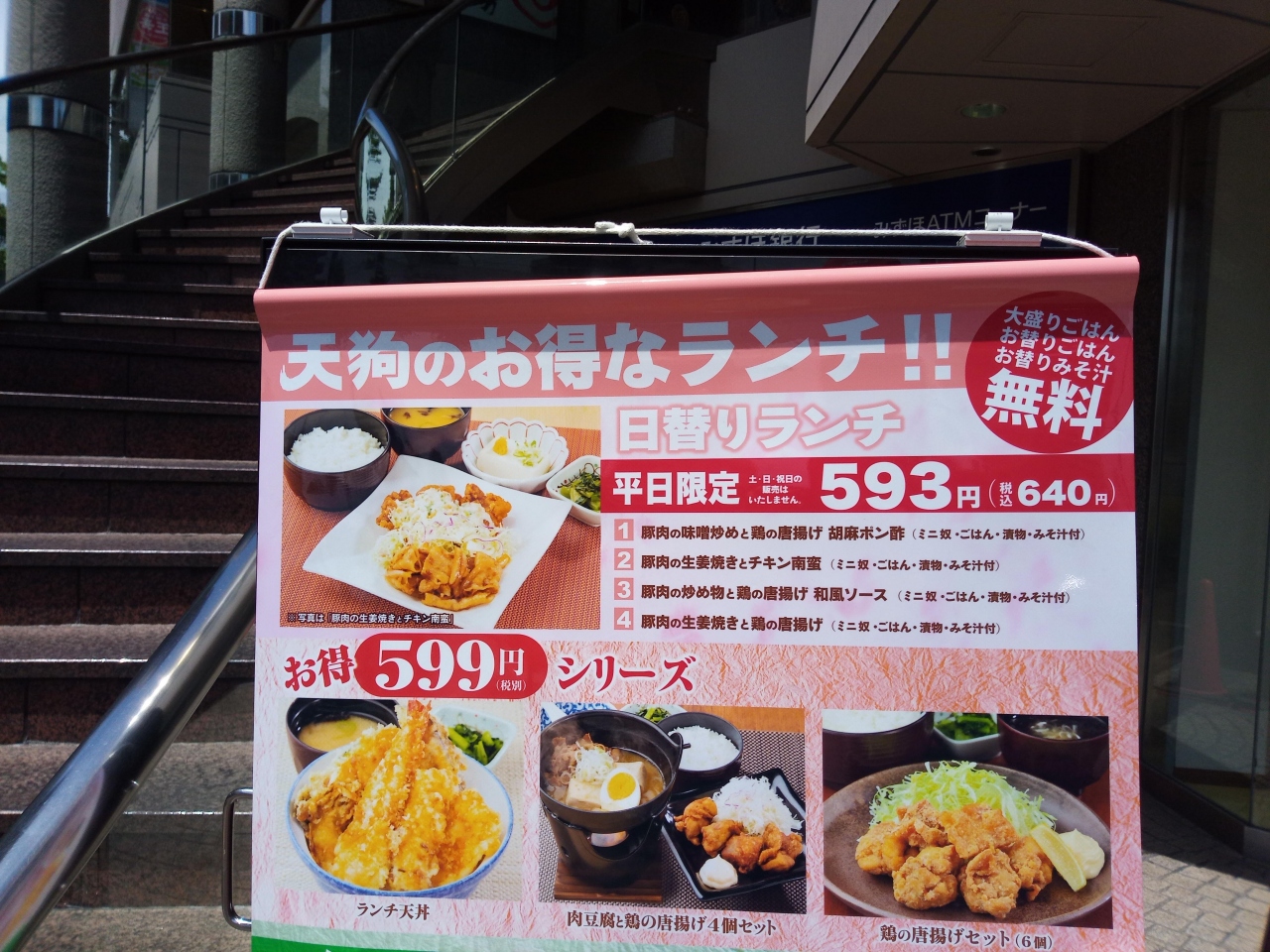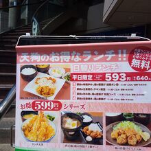 和食れすとらん 天狗 志村に丁目店では、添付写真のように、ランチタイムは格安で、599円の天丼がおいしくて結構ボリューム満点で、たいへんおすすめです。新型コロナウイルス蔓延で、財布に余裕がない時でも優しい飲食店です。