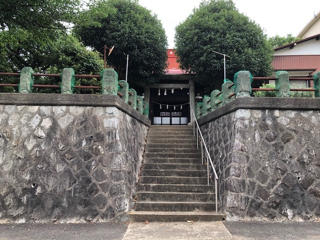 横浜市泉区にある上飯田団地のの敷地の中に、ポツンと建っている神社です。小田急線の高座渋谷駅と長後駅、どちらからも歩いて30分のところにあります。3mほどの高さの石垣の上に社殿がありますが、拝殿のようなものは見当たりませんでした。
