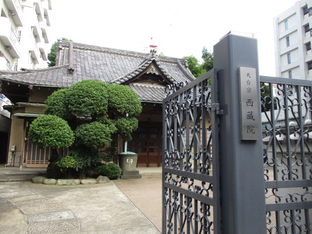 JR山手線田町駅より慶応仲通り商店街を散策し慶応交差点を渡り慶應義塾大学三田キャンパスを左に見ながらさらに行くと桜田通りを左折すると大松寺の先にある西蔵院に歩いて10分ぐらいでに着きます。西蔵院は天台宗の寺院で享徳元年(1452年)に数寄屋橋に創建され寛永12年(1635年)にこの地に移転した歴史ある寺院です。非公開ですが阿弥陀三尊像、阿弥陀如来、薬師如来、日光月光菩薩など多くの仏像が安置されているそうです。紺色の鉄門、境内は綺麗に整備されて、本堂の大屋根が風格を感じます。