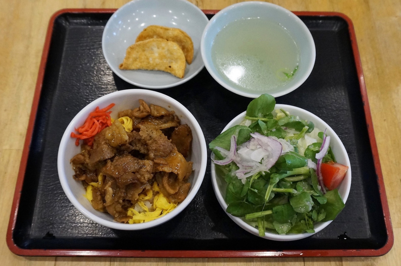 てり丼きんしミニとセット(揚げ餃子・スープ・サラダ)を注文。