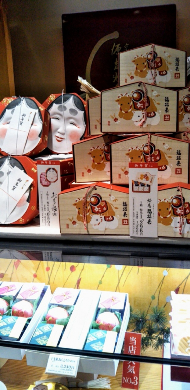 御正月になるとその年の干支の祝菓子が販売されています。絵馬の形をしたボックスパッケージもとても良いです。