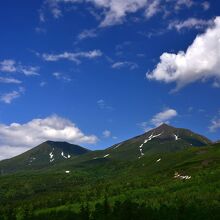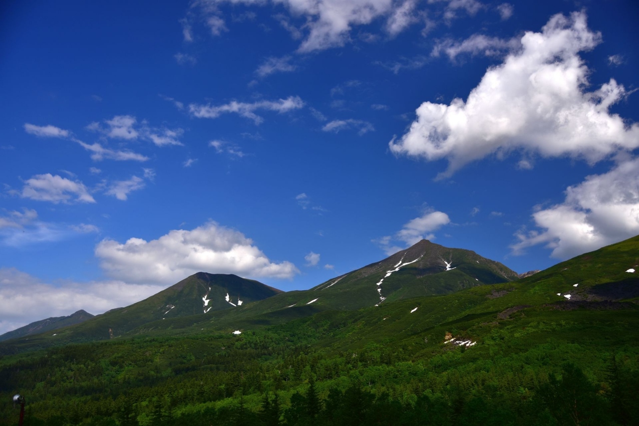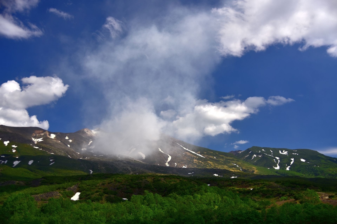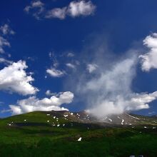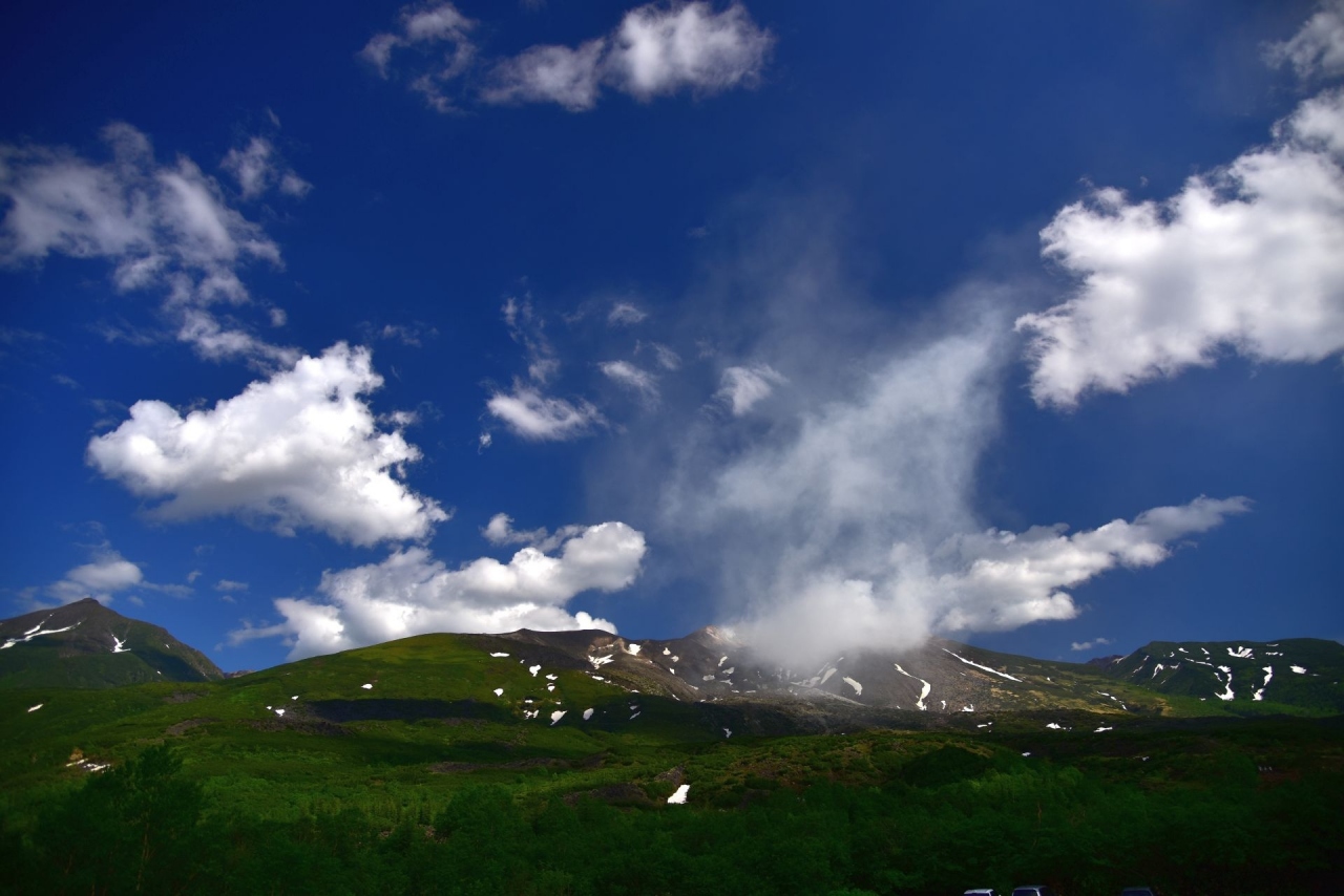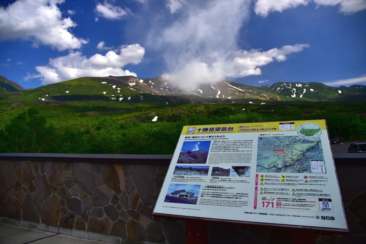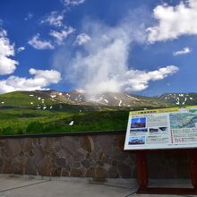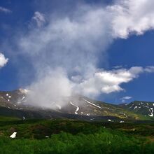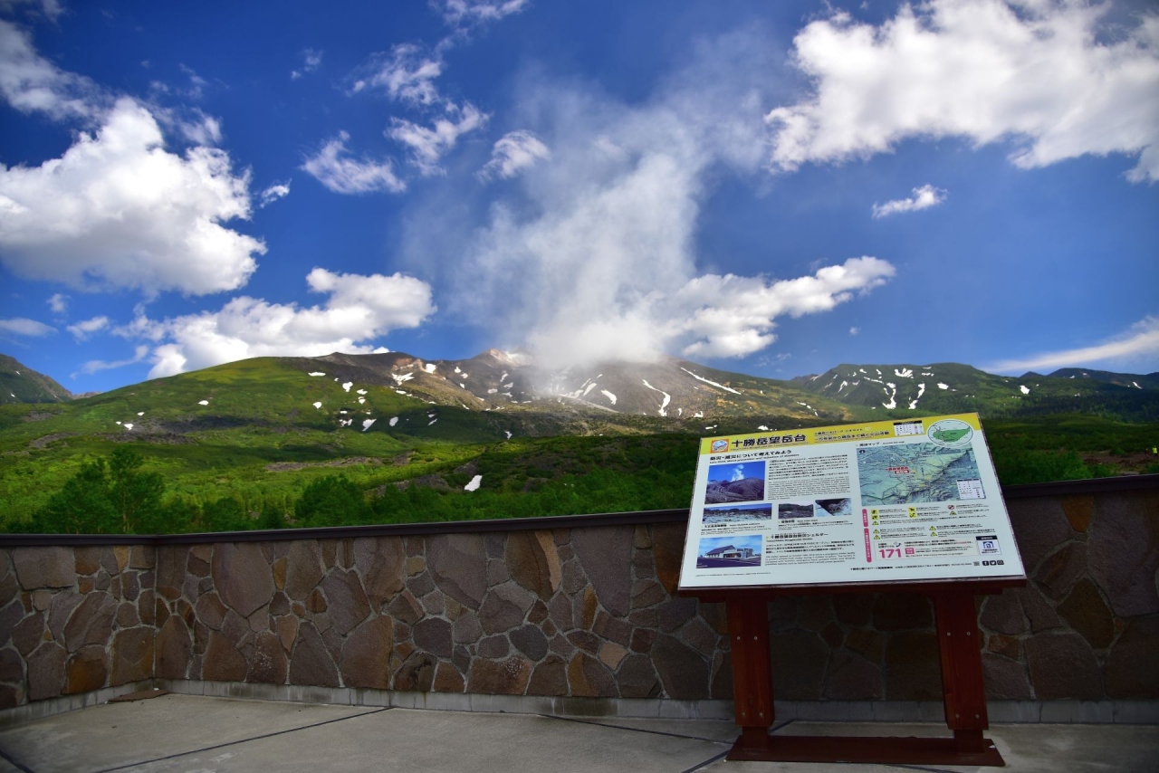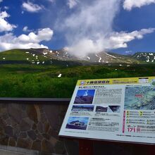 美瑛の白金温泉に宿泊する際、天気がよかったので噴煙を上げる十勝岳を見に望岳台へ行ってきました。十勝岳の上空を流れる白い雲と噴煙は明らかに識別できます。6月下旬ですが、十勝岳連峰には残雪が残り、なかなかの風景です。晴天の日にはぜひ一見の価値ありスポットです。