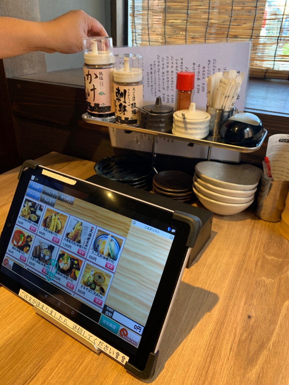 地元の人にも人気があるお店です。週末のランチタイムに伺いました。お昼の釜飯を注文。テーブル上にはあらかじめ刺身醤油や塩分ひかえめ醤油、七味などがセットされているので、自分の好みにあわせて調整することができました。