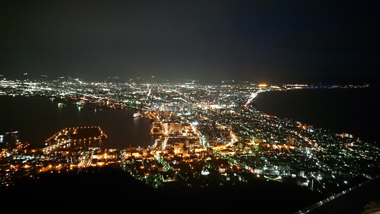 頂上からみる函館の夜景はパンフレット等でよくみるあの同じ景色。