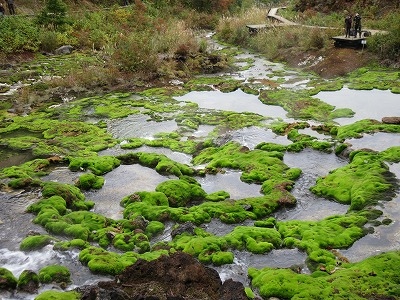 でも、説明を読んでみると、この周辺は、草津もそうでしたが、川は魚が生息できないほどの強酸性で、通常の苔は生息できないわけです。チャツボミコケは逆に、強酸性の火山性土壌にしか生息しない特別な苔なんですね。