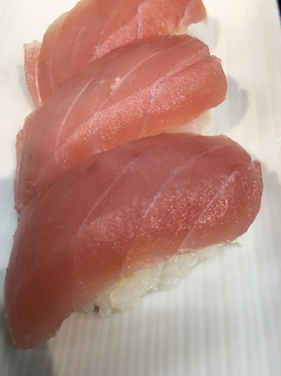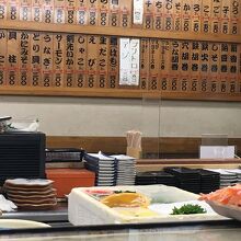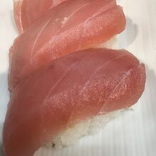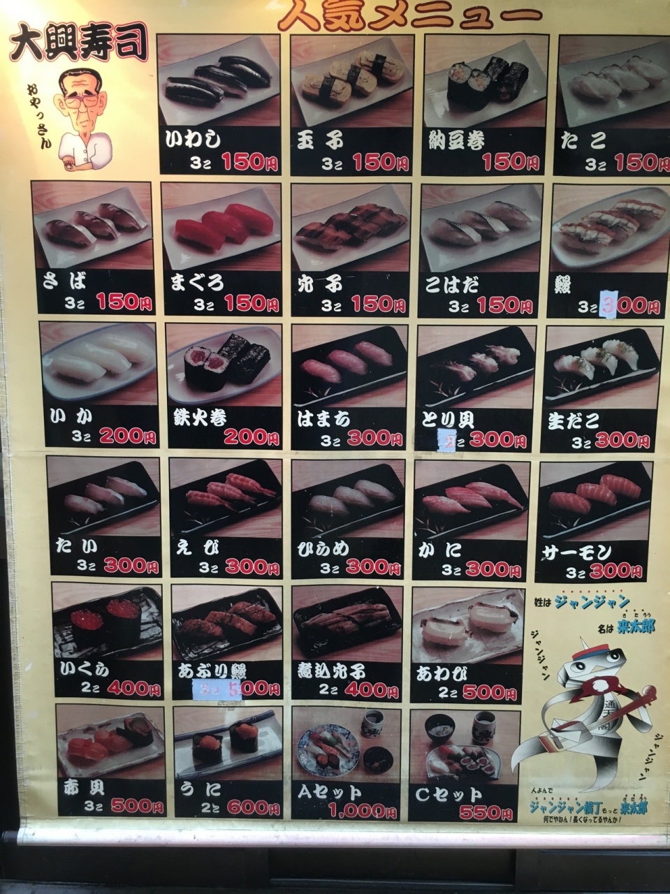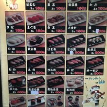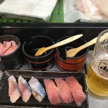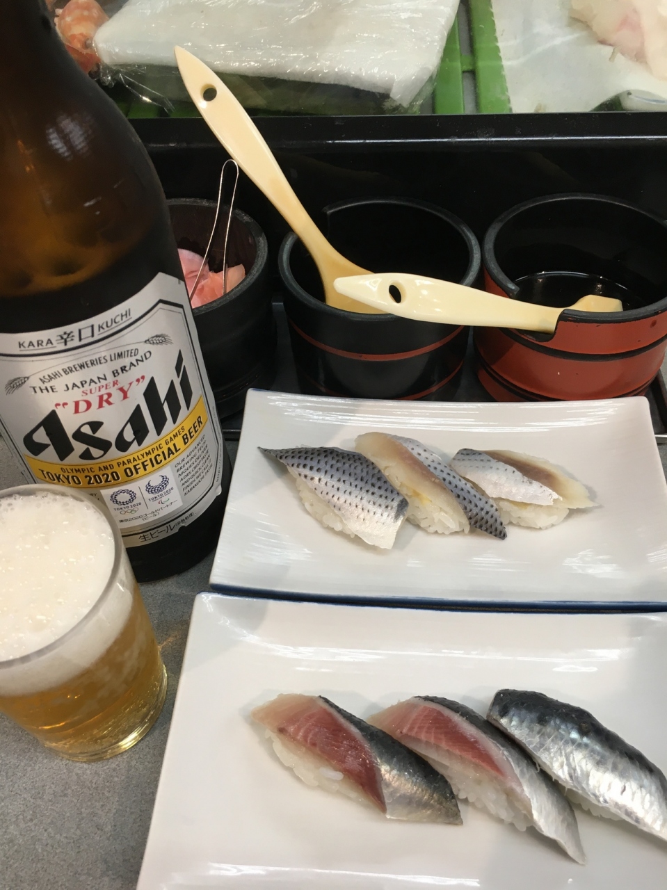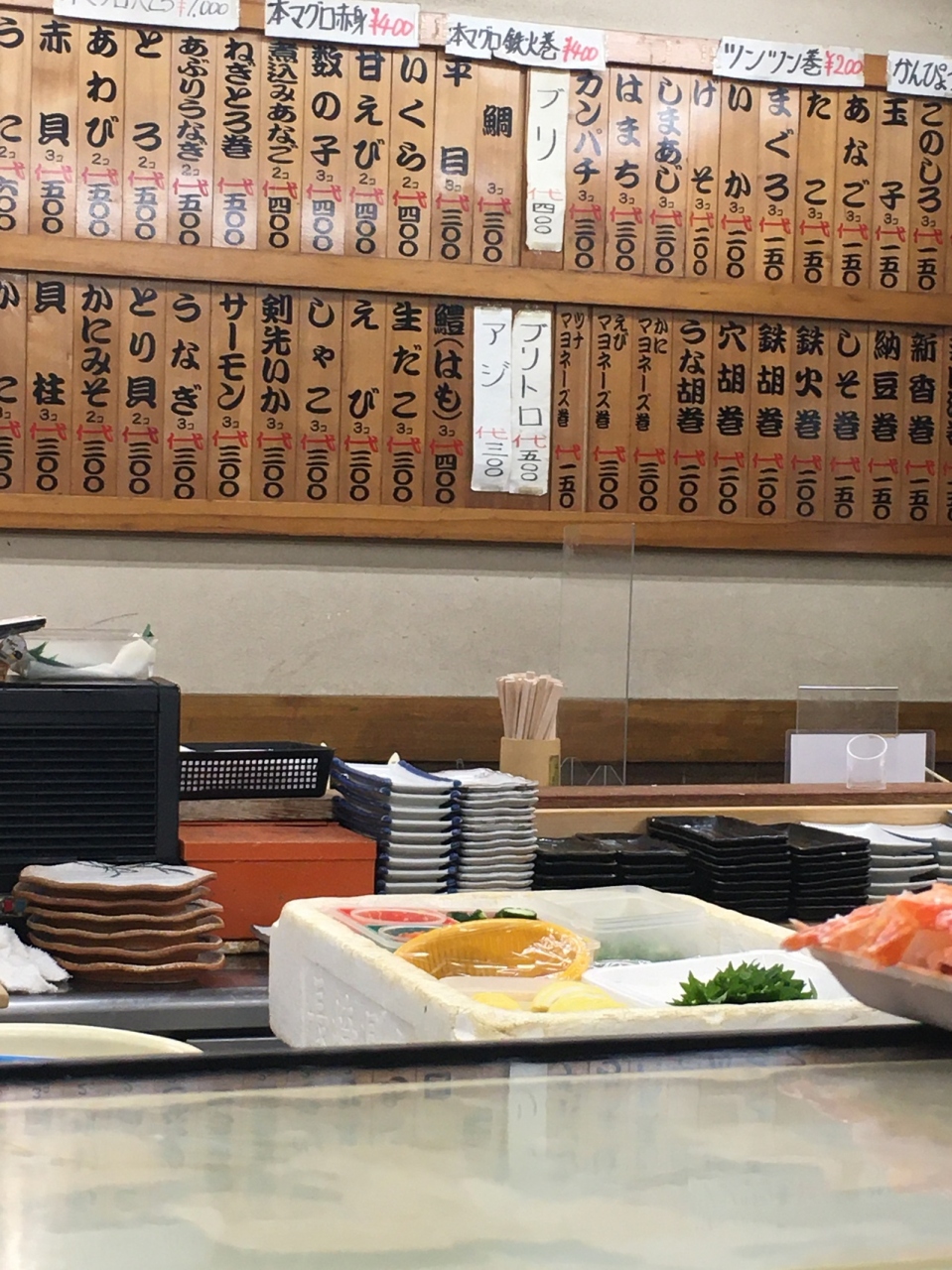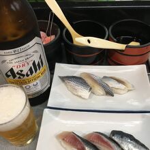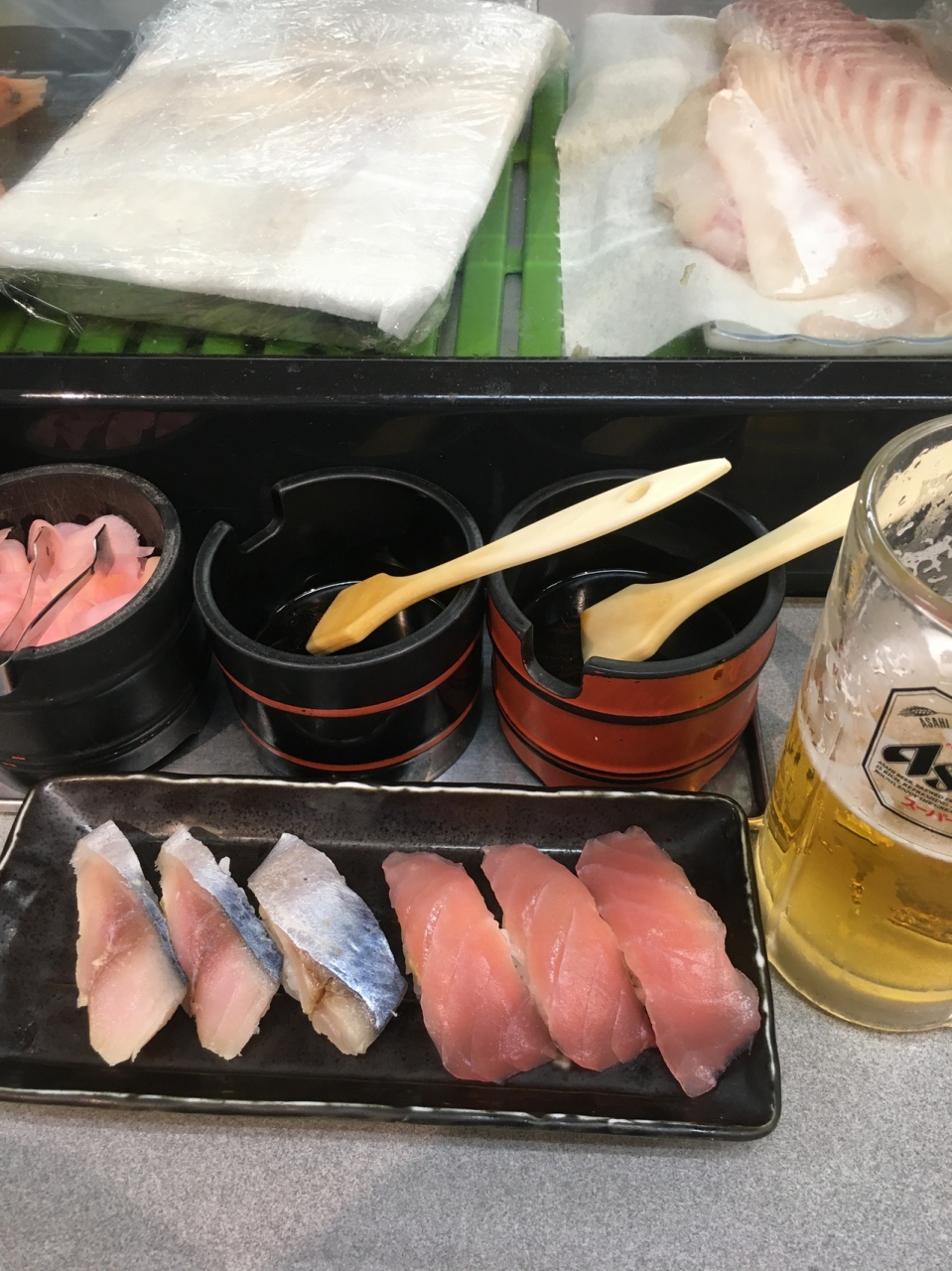 コの字型のカウンターの壁には、木の札で寿司のメニューが良い感じに掲載されていました。1皿3個で150円からと安く、生ビールと瓶ビールで、少しづつ握ってもらいました。ネタは小さめのネタで醤油はハケで寿司に塗って食べました。