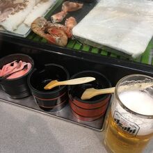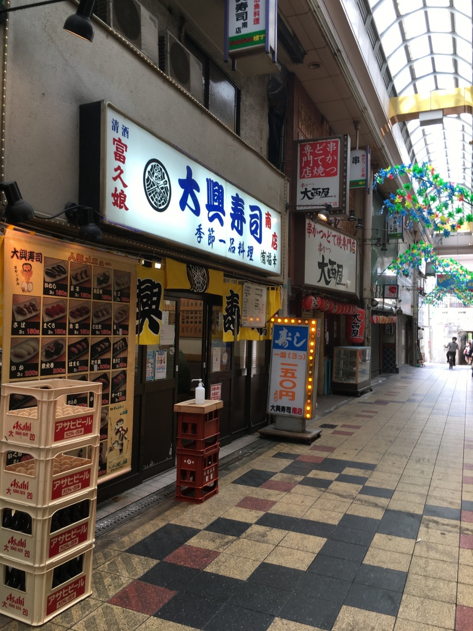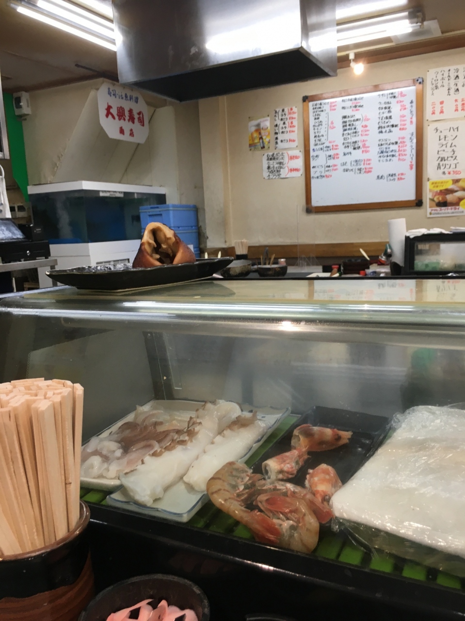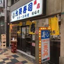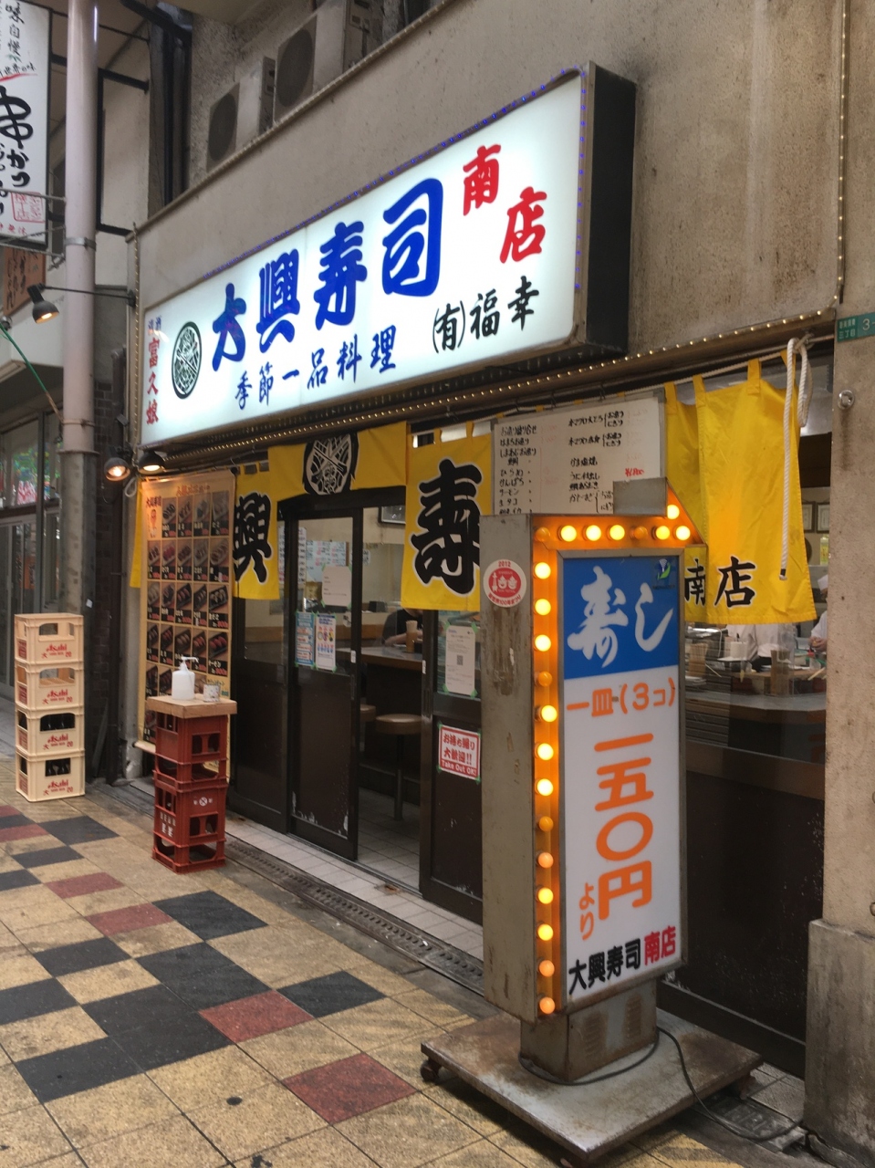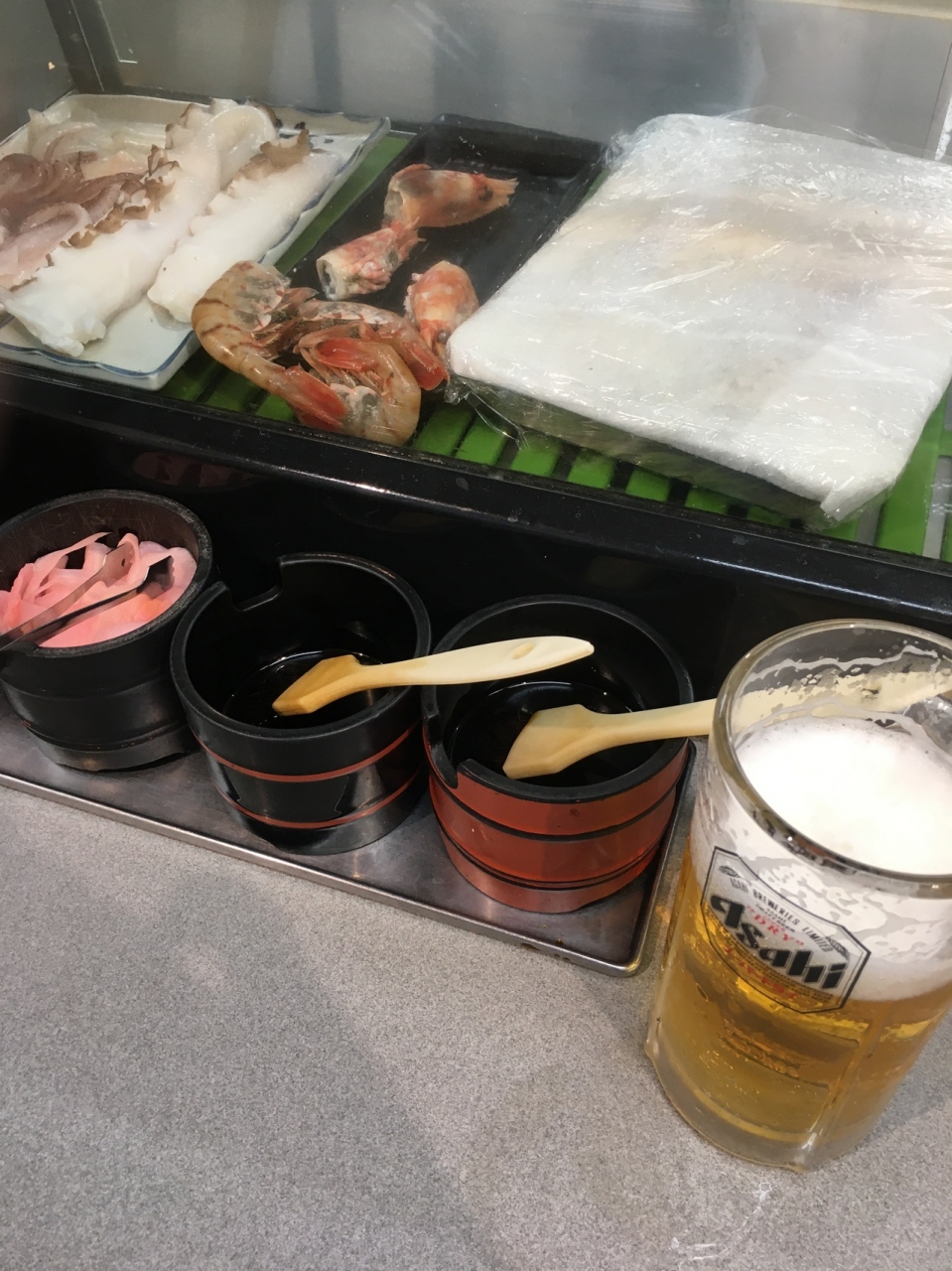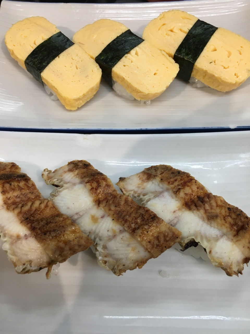 コの字型のカウンターの壁には、木の札で寿司のメニューが良い感じに掲載されていました。1皿3個で150円からと安く、生ビールと瓶ビールで、少しづつ握ってもらいました。ネタは小さめのネタで醤油はハケで寿司に塗って食べました。