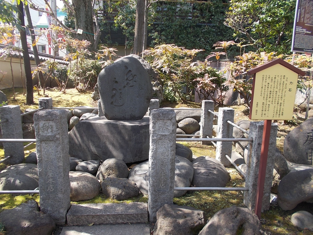 この浅草寺絵境内にある力石は境内の西側のエリアにあります。周りには多くの碑がたてられています。その中でもこの力石の碑は大きな力石に刻まれたものです。幕末にこの碑に使われている力石を持ち上げた人がいるのです。その業績を祝したものです。碑の周りにある石も力石だす。しかし碑に使われているのはひときわ大きいです。
