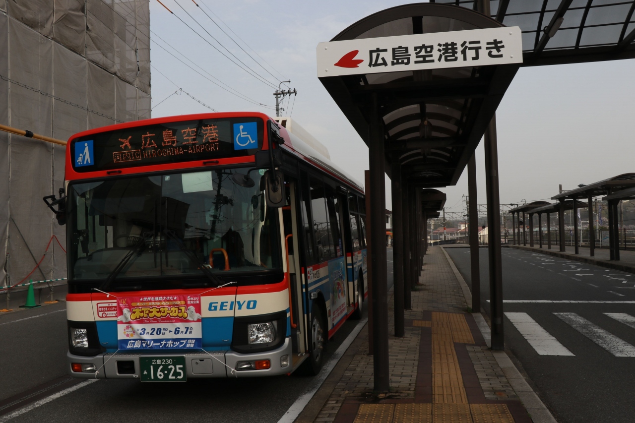 所要時間は15分ほどで運賃は400円。広島駅からのJR代を合わせてもこちらの方が安く上がります。こうした需要は一定数あるようでホームページには鉄道との乗り継ぎダイヤが一覧で出ているので気軽に使うことができますが、駅での乗り継ぎ時間が僅少なので遅れたりするとアウト。本数もそこまで多いわけではないので時間には余裕を持って利用したいところです。ICOCAなどをはじめ交通系ICカードは全て利用可とのこと。