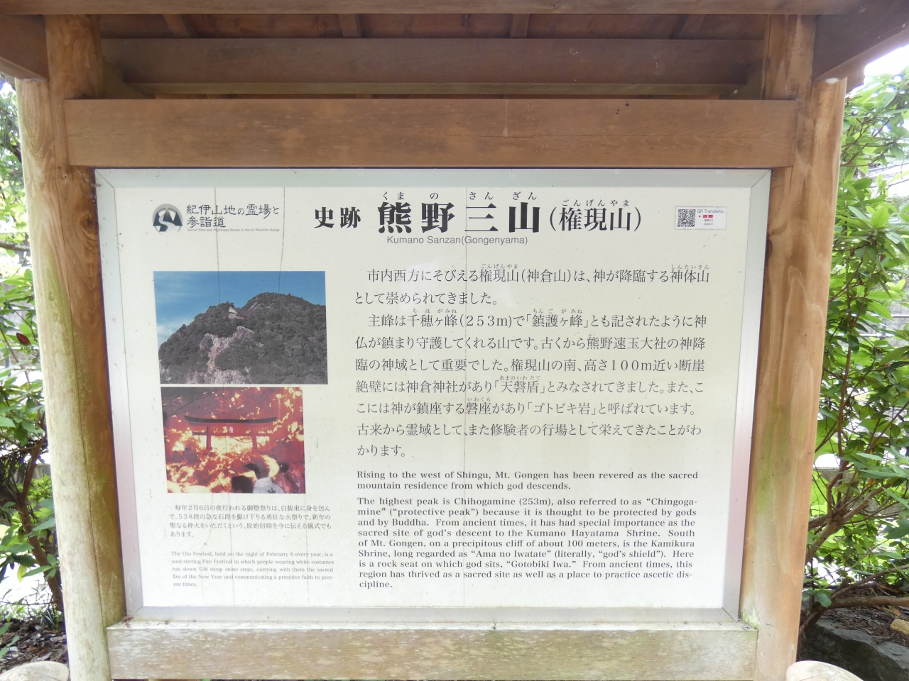 新宮市街地の西方にある山で神が降臨する神体山として崇められています。権現山(神倉山)の主峰は千穂ヶ峰(253m)、鎮護ヶ峰とも呼ばれ神仏が鎮まり守護してくれる霊剣あらたかな山です。南側の100mの高さの断崖絶壁に神倉神社が鎮座しています。神社も山も上るのは高齢者や幼児には無理です、下から御参りをお薦めします。