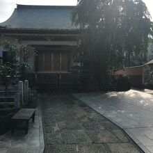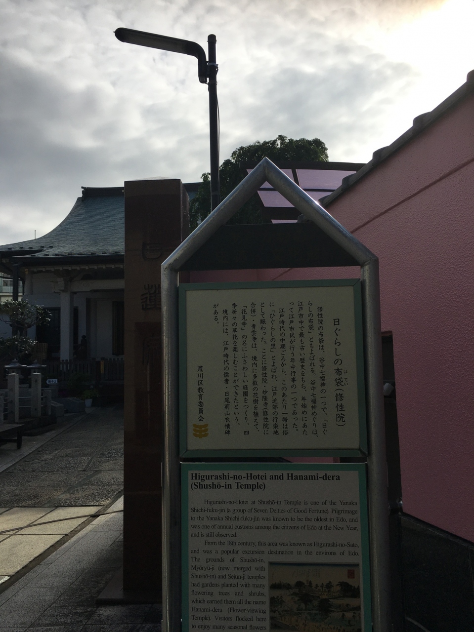 壁がピンクの色なので目立ち、布袋様の絵も描かれていました。本堂右側には大きな木があり、葉っぱが下の方に垂れ下がっていました。住宅街に囲まれたような寺で、お墓のエリアも広いです。江戸時代中期には、ひぐらしの里と呼ばれて賑わったようです。