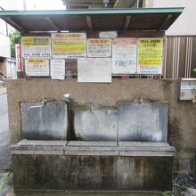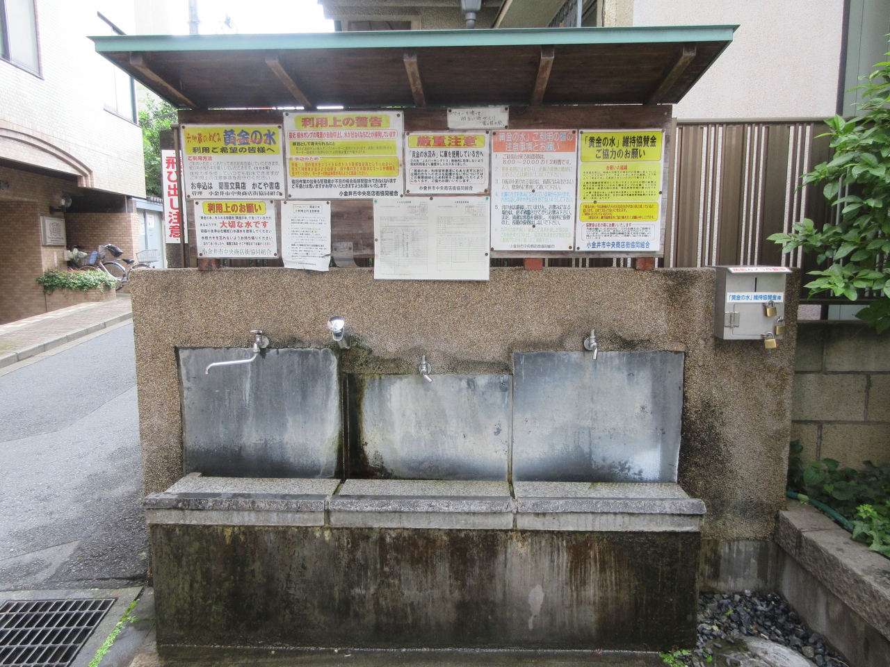 中央線・武蔵小金井駅南口から小金井街道を500mほど進み、前原坂上交差点を左折、最初の路地を曲がった、六角形の石に六地蔵が刻まれた敷地に造られています。17年程前に中央商店街の活性化のために、地下100mに井戸を掘り地下水を提供し始めたそうです。地下水が出る蛇口は2か所あり、500円払えばだれでも水栓鍵がもらえ利用できるシステムになっています。試飲用蛇口が1つあり、押すとカップ一杯の地下水が、一番左側の蛇口からは容器を洗うための水道水が出る仕組みになっていました。現在3500人ほどが利用しているとのことです。