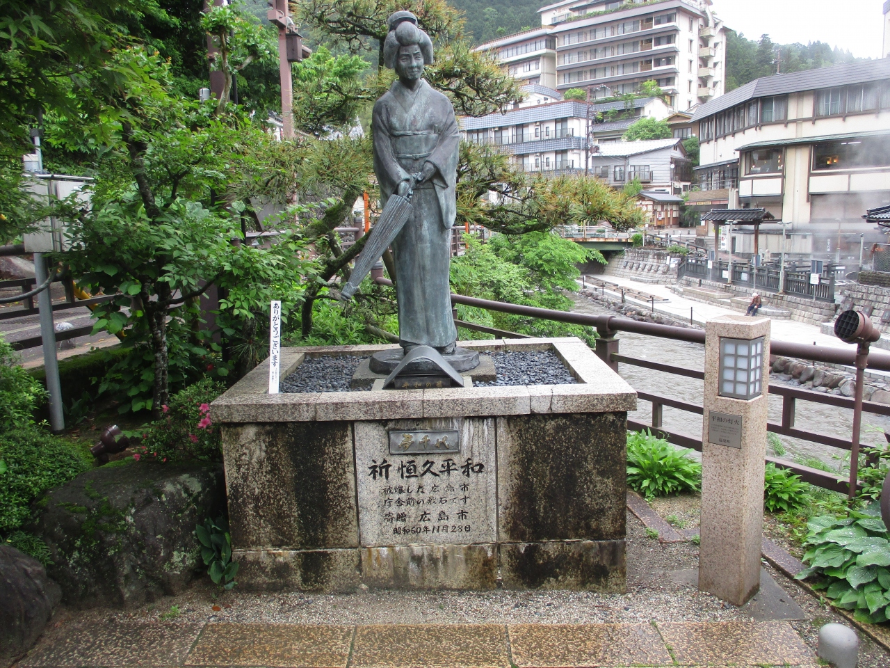 夢千代像の一角に夢千代の祈りがありました。広島の平和記念公園の平和の灯から分けられた火が、夢千代の祈りというモニュメントのなかで、光を灯し続けています。夢千代日記を通じた広島市との平和交流の目的で分火された光景を見ながら、強く世界が平和であることを祈りました。